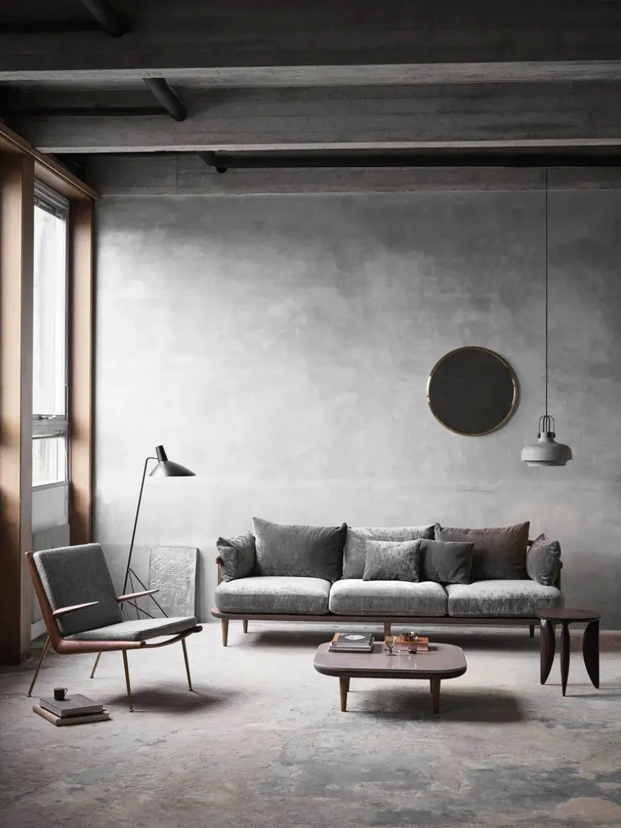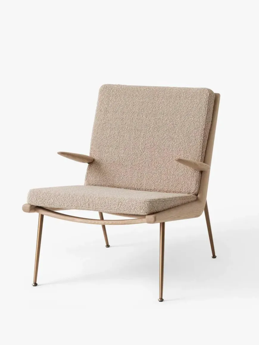 Boomerang lænestolen fra 1956 er designet af Hvidt & Mølgaard og laves nu af &Tradition. Vælg HM2 med armlæn i mange forskellige stoftyper med stel i eg eller valnød med ben i messing.