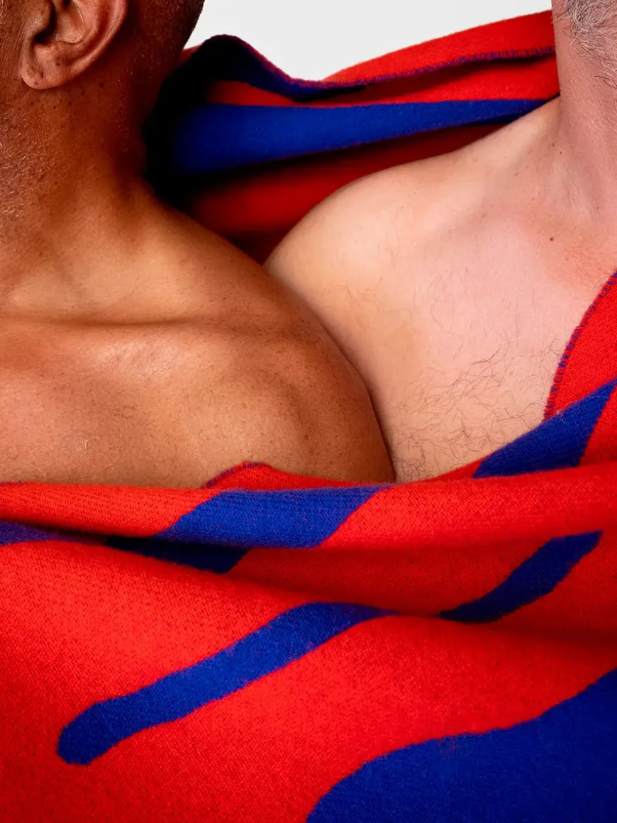 De moderne Brush plaider kommer i tre forskellige farver. Her er tæppet i farven blue/red. Tæppet vil med sine farver og de små frynser i enderne pynte både i stuen og soveværelset. Plaiden vil være et ekstra statement i indretningen med de blå og røde farver.