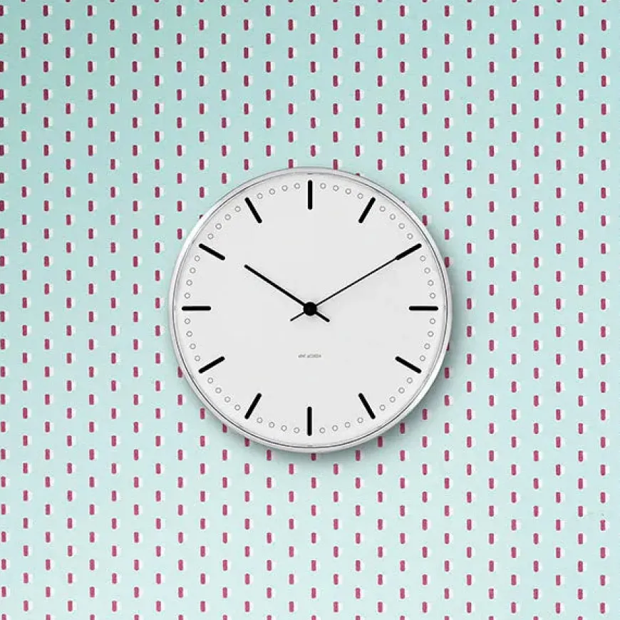 Arne Jacobsen er designeren bag dette smukke vægur. Væguret blev i sin tid designet til Rødovre rådhus, som sidenhen har udviklet sig til flere andre udgaver. Det tidløse og enkle design har gjort væguret meget populært. Samtidig kan city hall væguret fås i flere forskellige størrelser. Væguret fås også i en “royal blue” udgave. Væguret er lavet i aluminium og glas.