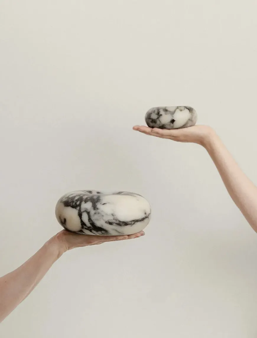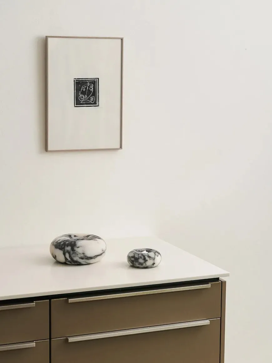 Cosmos er halvt brugsgenstand, halvt kunstobjekt. Det lille kugleformede objekt har en lille fordybning som gør, at der kan lægges noget i eller på det. Cosmos er udformet i den smukke marmor, calacatta violetta, som er med store aftegninger og meget unik. Cosmos fås i to forskellige størrelser, og de er flotte at bruge sammen. Den store her kan eksempelvis bruges med frugt eller som skulptur.
