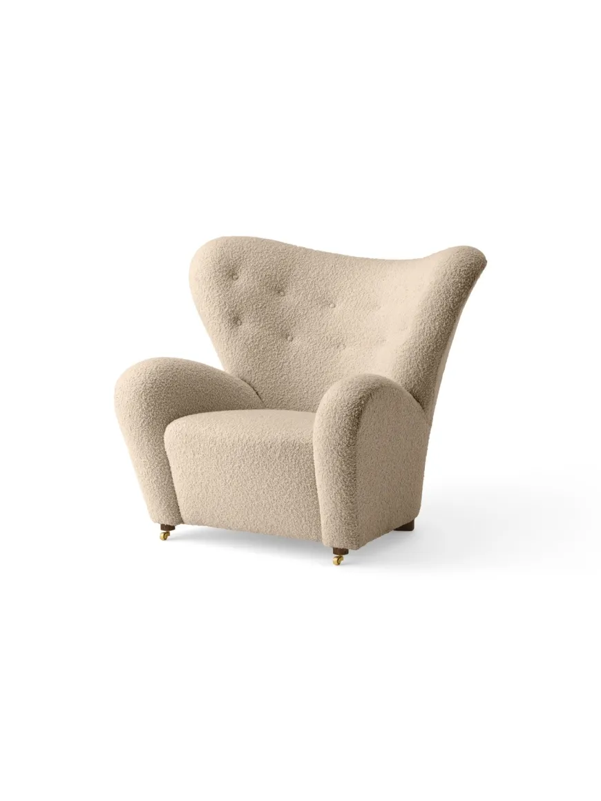 Den Trætte Mand i Baena 15 (lys beige bouclé) er Audo Copenhagens poetiske opdatering af Flemming Lassens klassiker. Den runde, “vingede” form omslutter kroppen, mens den taktile bouclé giver rolig varme til indretningen. Vælg ben i eg for et lyst, naturligt udtryk – eller mørkbejdset eg for en skarp, grafisk kontrast. Med forreste messinghjul, generøse mål og mulighed for matchende ottoman er dette et tidløst statement-piece skabt til hverdagsluksus i stuen, læsehjørnet eller soveværelset.