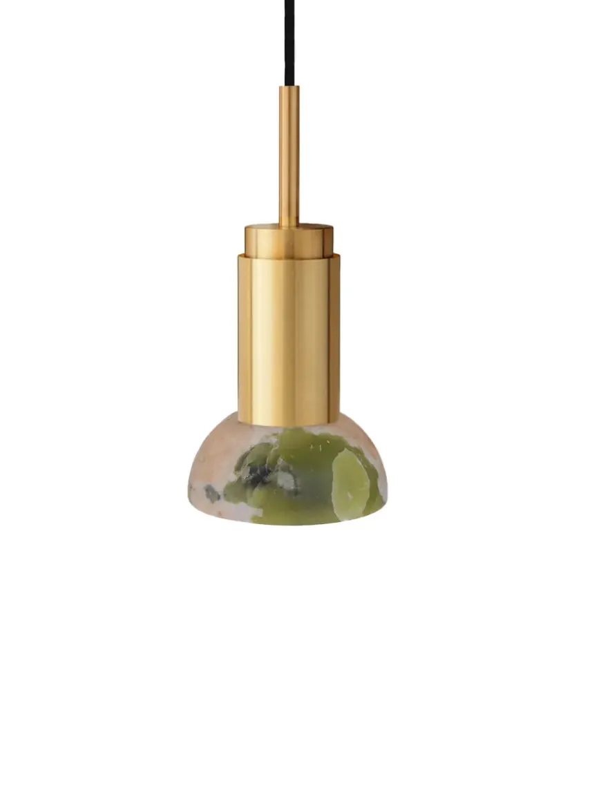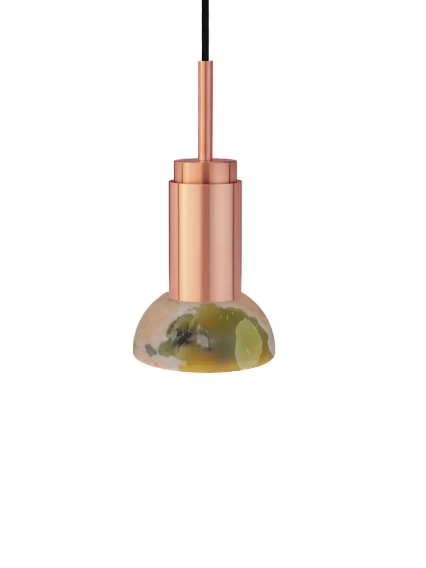Nu fås Donya lampen fra Anour med skønne skærme i sten. Lampeskærmen her er i mixet Onyx og halvmåneformet. Onyx er en natursten, som er fyldt med harmoni og i skønne farver. Den grønne/orange/hvide skærm kommer med, hvad der ligner revner, som giver et skønt og diffust lys. Donya lampen er ideel at bruge over køkkenbordet eller til at sætte sammen flere og så hænge over spisebordet. Da skærmen er i natursten, vil hver eneste Donya ONYX Moon lampe være unik og helt sin egen. Donya lampefatningen kommer i mange forskellige finishes og materialer.