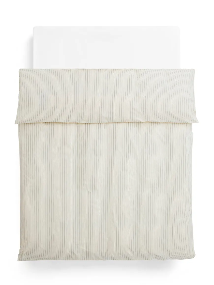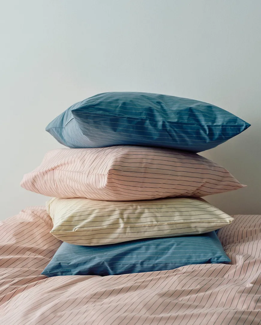 Fineline Pillow Case fra HAY er et elegant og tidløst pudebetræk, der kombinerer klassiske striber med blød, økologisk bomuld. Det er fremstillet i percalevævet bomuld, som føles sprød og kølig mod huden og giver en behagelig, frisk fornemmelse nat efter nat.