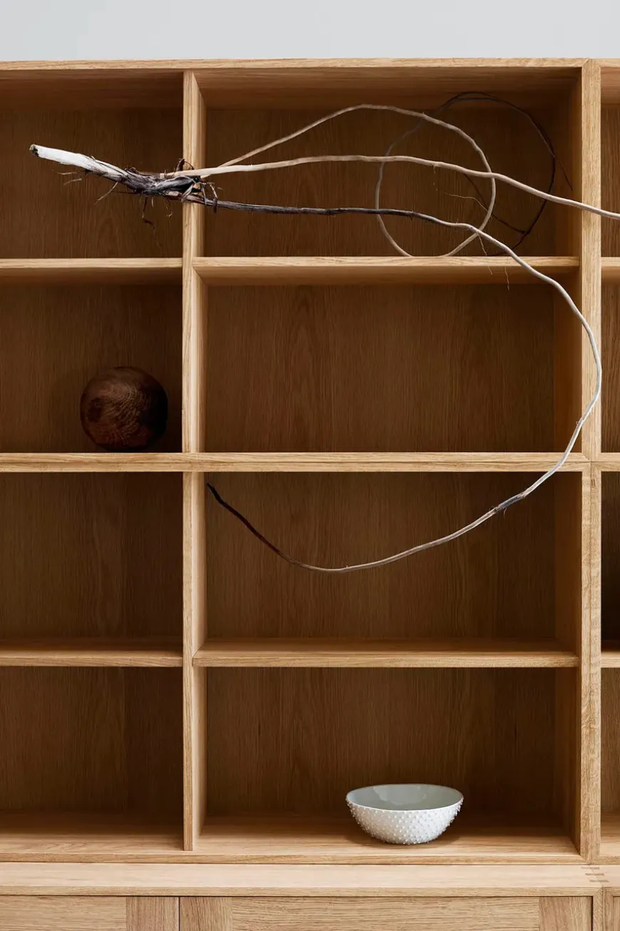 FK63 Bookcase System Bogreolsystemet fra Carl Hansen & Søn er tegnet af Preben Fabricius og Jørgen Kastholm i 1963 og er et særpræget møbel til ethvert rum. FK63 Reolsystemet tilbydes i en vægmonteret udgave såvel som i et fritstående design, der hviler på et slankt stel i pulverlakeret stål. Dette modul har to åbne rum og syv bakker.
