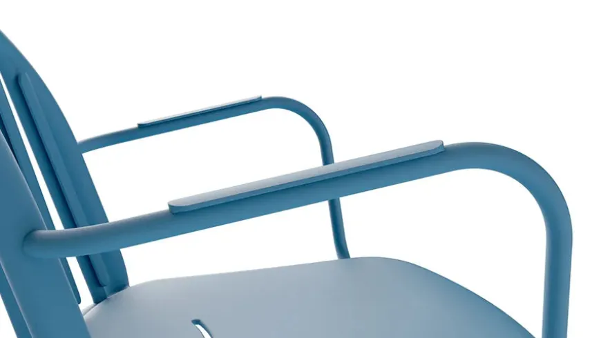 Fred’s armchair er en moderne fortolkning af den klassiske bistrostol. Stolen er fremstillet af vejrbestandigt aluminium og er perfekt til både private terrasser og udendørs caféområder. Det buede sæde og armlænene sikrer optimal siddekomfort. Den smileformede åbning i sædet lader regnvand løbe væk, så stolen altid er klar til brug.