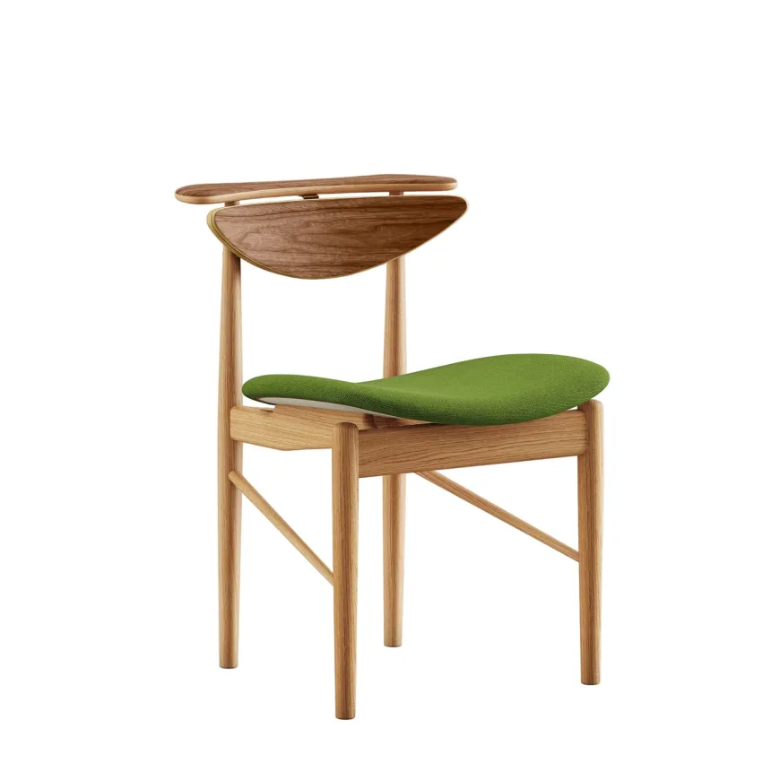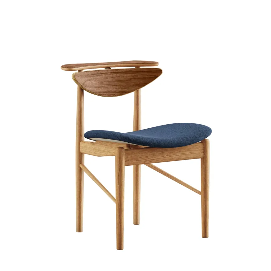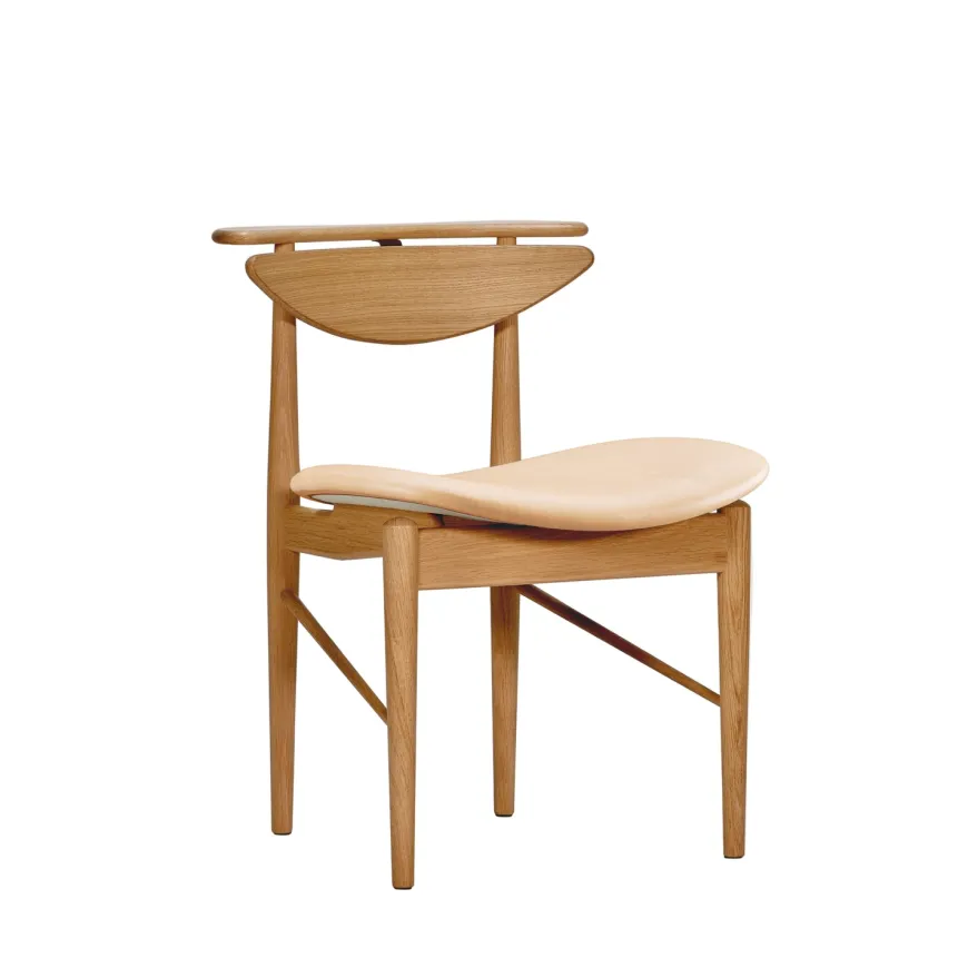 Reading Chair i eg olie er Finn Juhls elegante fortolkning af en komfortabel spisebordsstol, der også inviterer til fordybelse. Den slanke træramme og den karakteristiske vandrette rygkarm giver naturlig støtte til armene, mens de organiske linjer og den varme overflade i olieret eg tilfører rummet ro og raffinement. Stolen er lige så smuk i et moderne spisemiljø som i et loungehjørne og vidner om Juhls skulpturelle tilgang, hvor funktion og æstetik går hånd i hånd. Med sin gennemtænkte ergonomi og lette udtryk er Reading Chair et tidløst valg, der holder i både form og kvalitet.