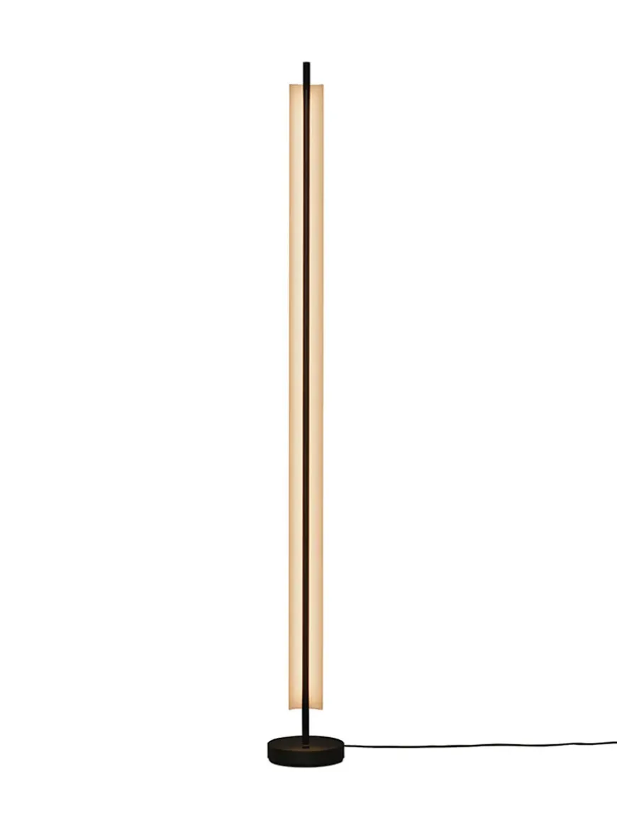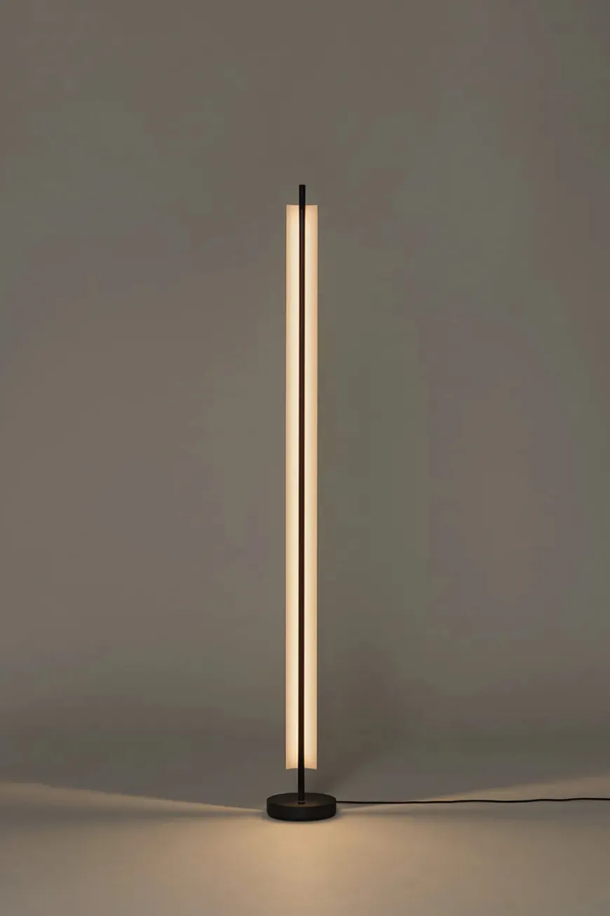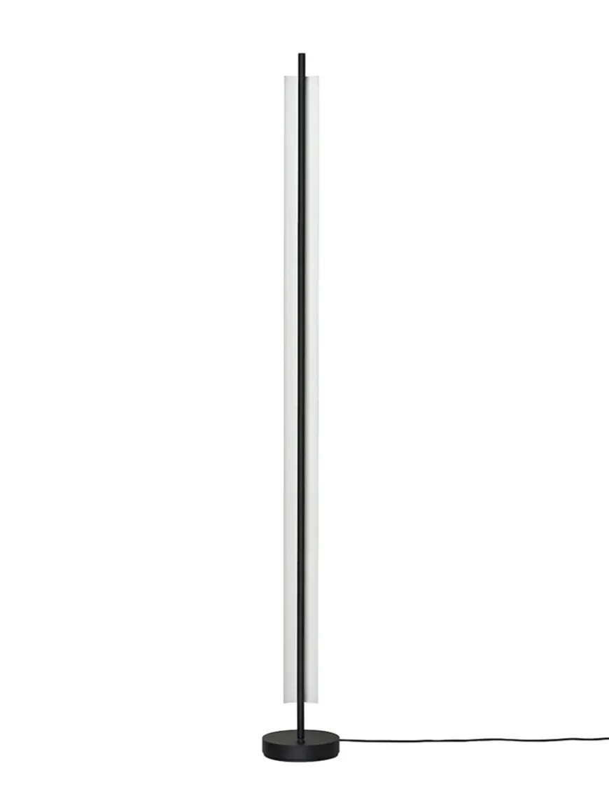 Lámina 165 gulvlampen har et minimalistisk og strømlinet design. Lampen passer perfekt ind i den moderne boligindretning med dens slanke silhuet. Lámina gulvlampen er udstyret med indbygget LED-lys og en tynd metalplade, der svagt men effektivt spreder lyset. Lampen ligner en lysende skulptur og kan bruges i flere rum i hjemmet. Skærmen er i en hvidgrå farve med blank finish udvendig, mens stellet er sort med mat finish.