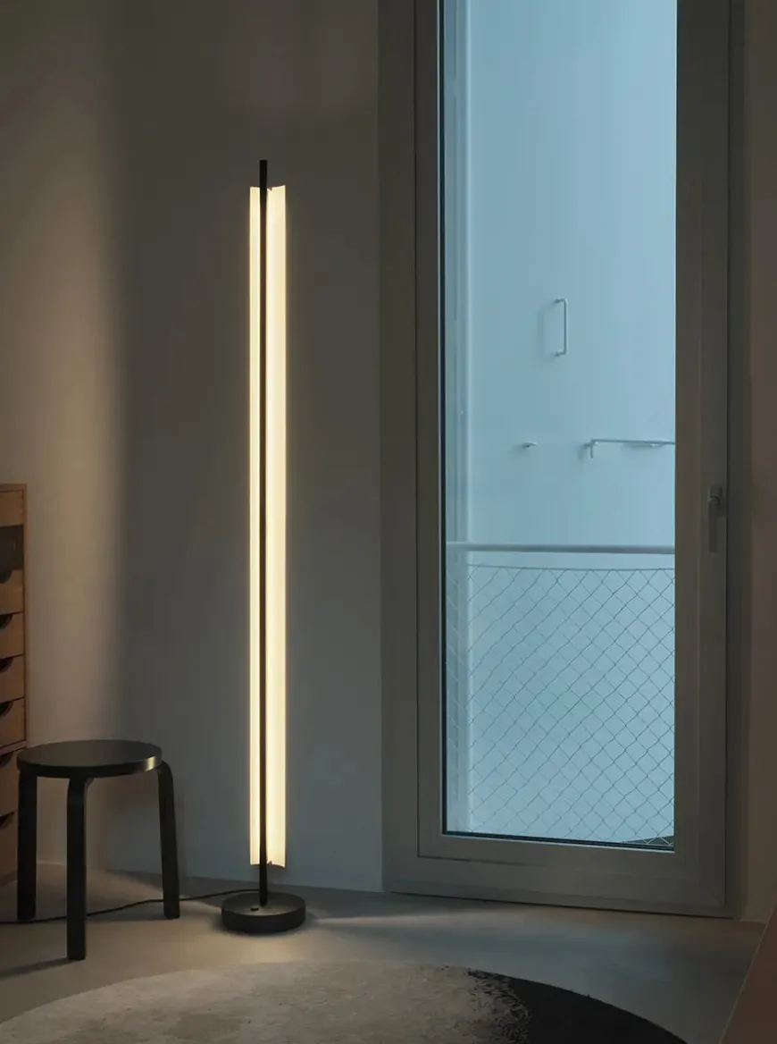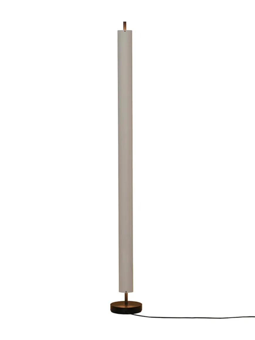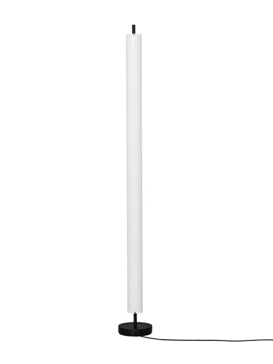 Lámina 165 gulvlampen har et minimalistisk og strømlinet design. Lampen passer perfekt ind i den moderne boligindretning med dens slanke silhuet. Lámina gulvlampen er udstyret med indbygget LED-lys og en tynd metalplade, der svagt men effektivt spreder lyset. Lampen ligner en lysende skulptur og kan bruges i flere rum i hjemmet. Skærmen er i en hvidgrå farve med blank finish udvendig, mens stellet er sort med mat finish.