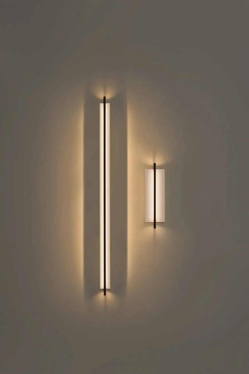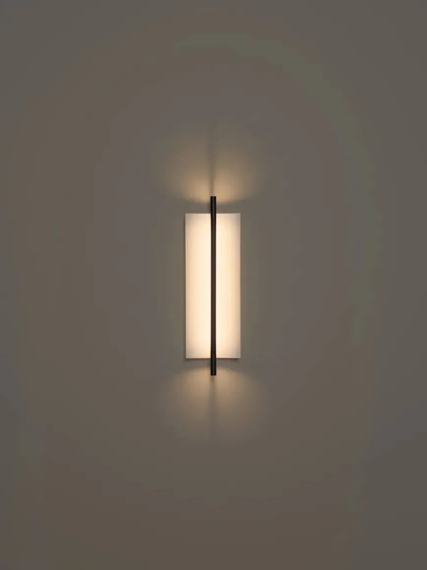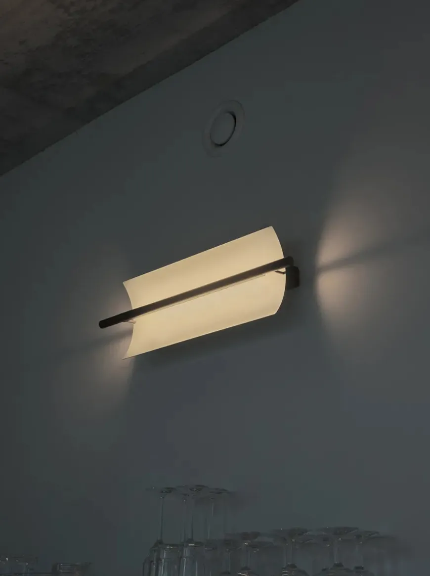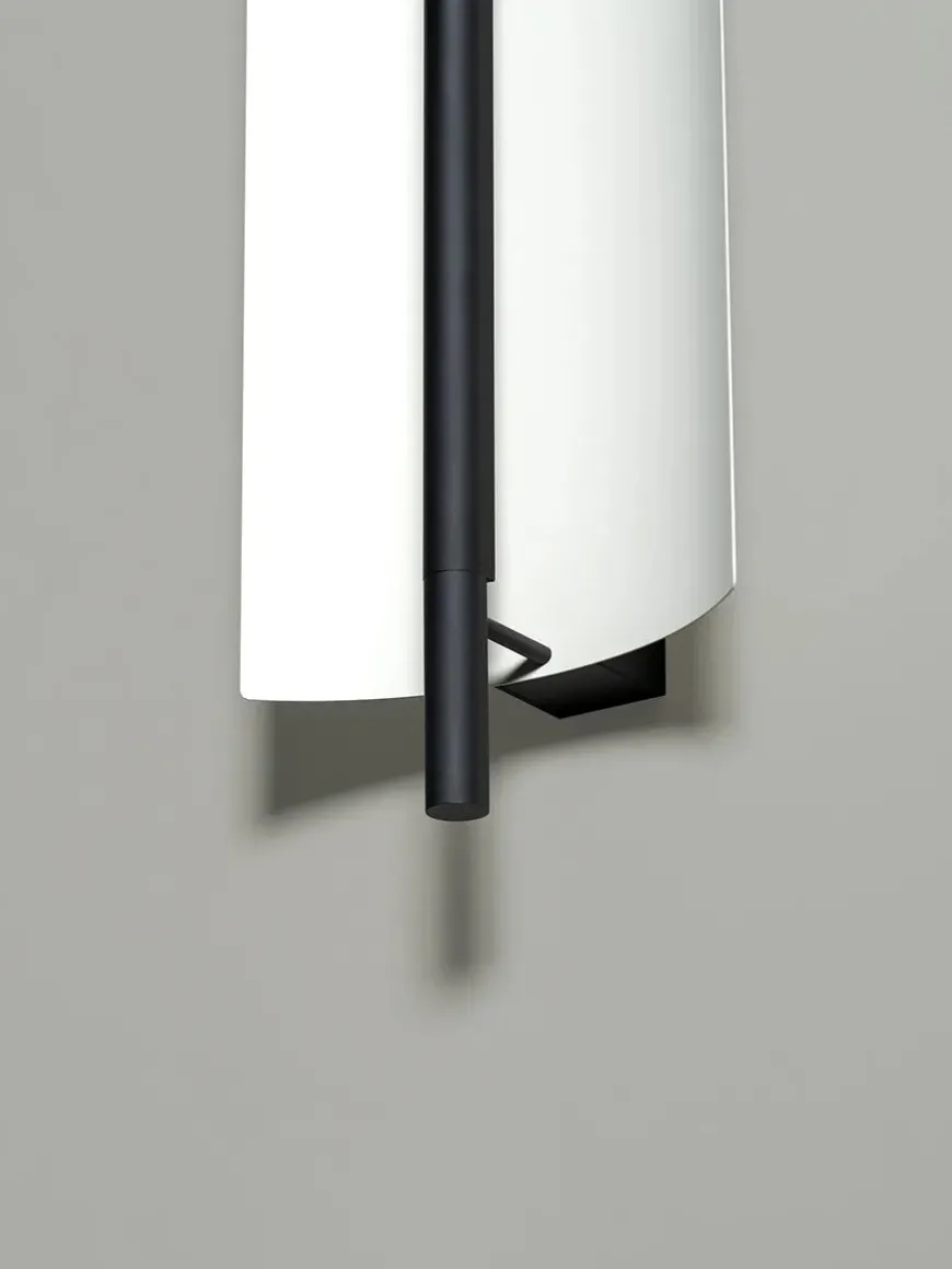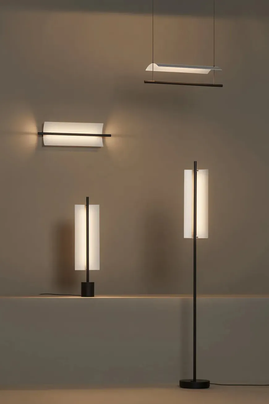 Lámina 45 væglampen har et minimalistisk og strømlinet design. Lampen passer perfekt ind i den moderne boligindretning med dens slanke silhuet. Lámina væglampen er udstyret med indbygget LED-lys og en tynd metalplade, der svagt men effektivt spreder lyset. Lampen ligner en lysende skulptur og kan bruges i flere rum i hjemmet. Skærmen er i en hvidgrå farve med blank finish udvendig, mens stellet er sort med mat finish.