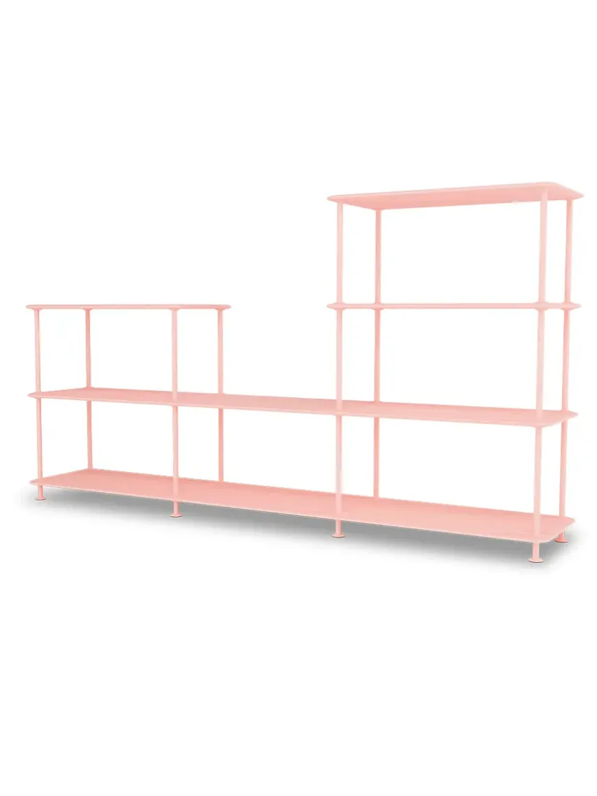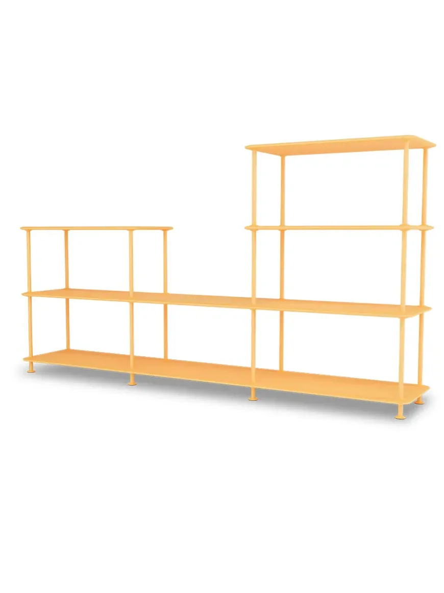 Montana Free reolsystemet er opbygget af lakerede MDF-hylder i dybde 38 adskilt af tynde stager, der giver et let og svævende udtryk og understreger de horisontale hylder.