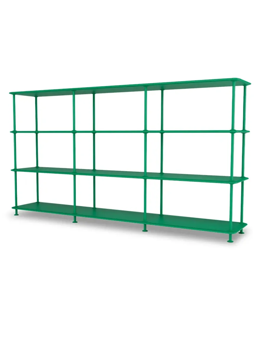Montana Free reolsystemet er opbygget af lakerede MDF-hylder i dybde 38 adskilt af tynde stager i krom, der giver et let og svævende udtryk og understreger de horisontale hylder.