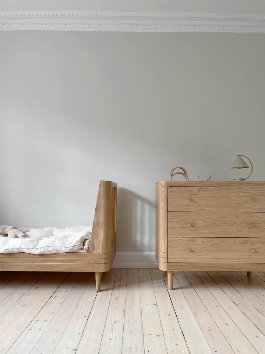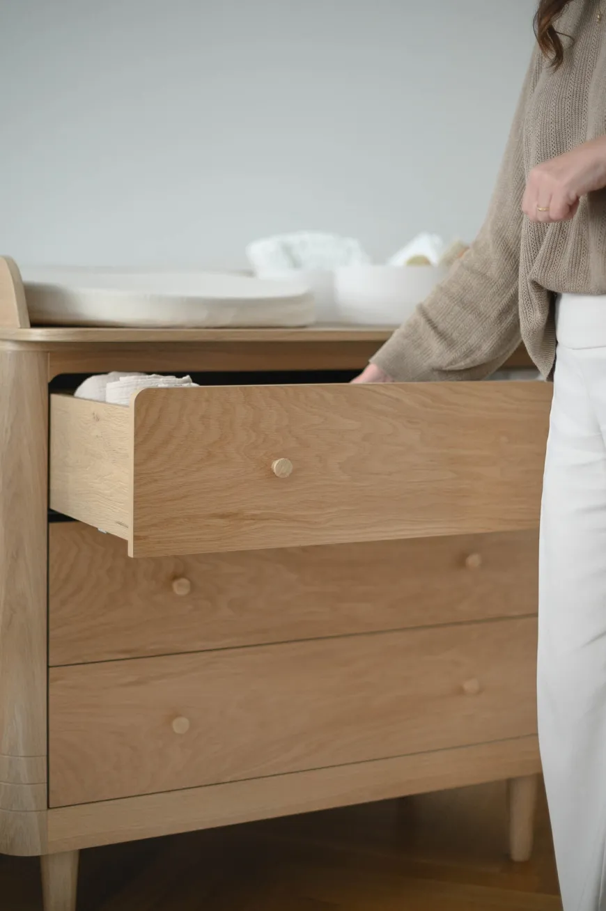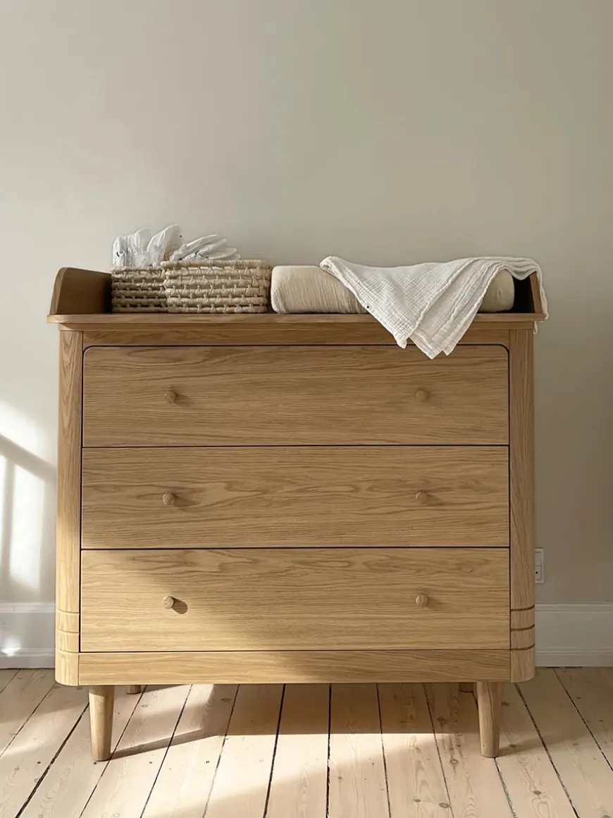 Nature kommoden i eg er en smuk tilføjelse til vores Nature 2.0 serie, og den passer perfekt til både Nature Tremmesengen og Nature Juniorsengen. Kommoden indeholder tre rummelige skuffer, så der er masser af plads til tøj eller andre ting. Kommoden er både smuk og praktisk – og den kan stå overalt i hjemme. Barnet kan endda tage den med sig, når han eller hun flytter hjemmefra. Ved tilkøb af Nature pusletoppen, kan kommoden nemt – og helt uden at lave grimme huller – laves om til en puslekommode.