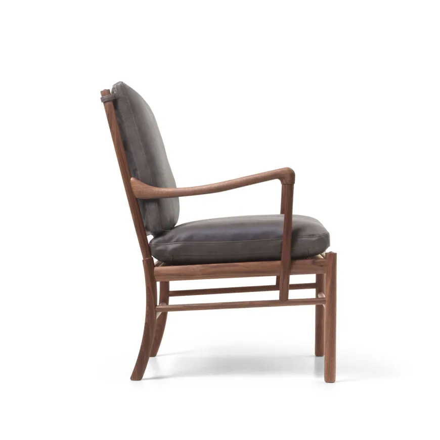 OW149 Colonial lænestol i olieret valnød med TERRA®-læder hylder Ole Wanschers raffinerede minimalisme. Den slanke træramme og de let svungne armlæn giver et luftigt udtryk, mens de bløde, formstabile puder inviterer til ro. Det håndflettede sæde i rørflet understreger den klassiske lethed og kan udskiftes ved behov – et gennemført møbel, der kombinerer holdbarhed, komfort og ikonisk dansk håndværk. Match gerne med OW149F fodskammel for fuld loungestemning.