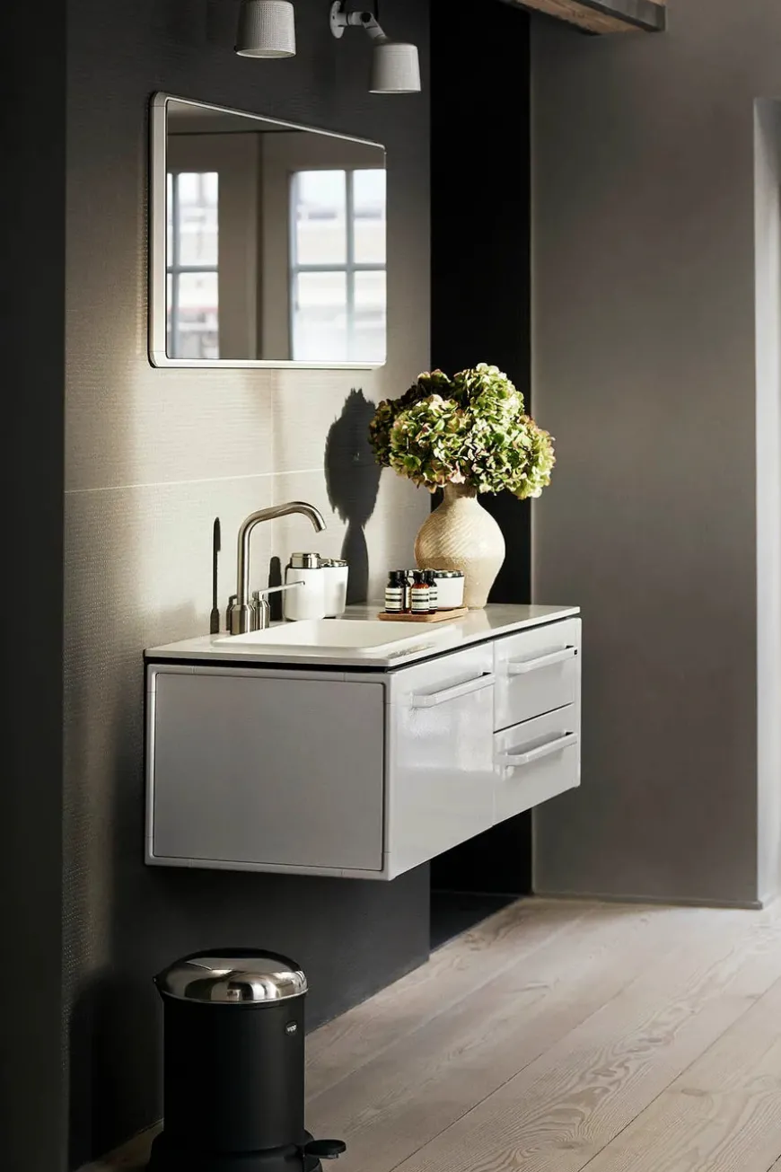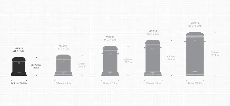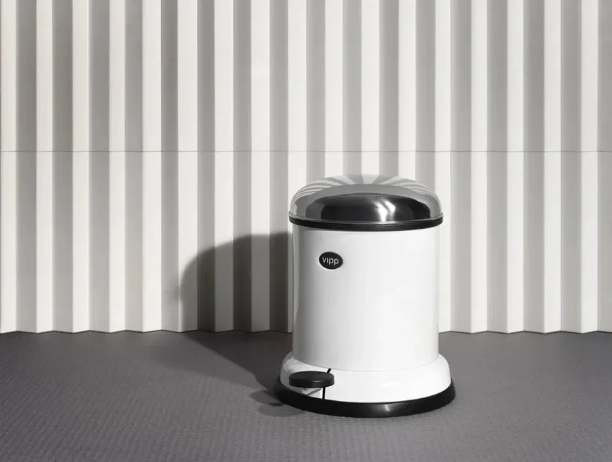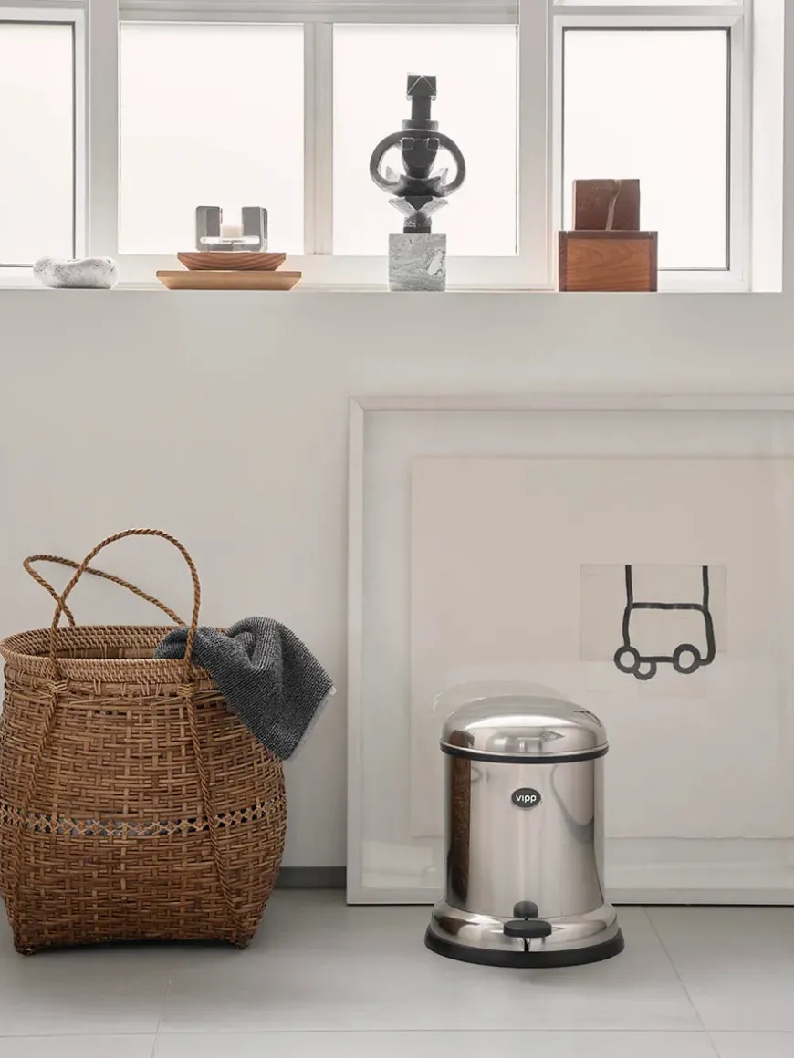 Stainless Steel Collection Nu er de klassiske VIPP spande produceret uden pulverlakering. Det rå, polerede stål tilfører et autentisk look til de smukke og super funktionelle spande. Tilfør tidløse materialer og fantastisk design til dit badeværelse, køkken eller kontor. VIPPs spande er et must i ethvert hjem. Vipp13 pedalspanden er en af de mindre Vipp pedalspande og er ideel til små badeværelser. Denne pedalspand rummer 4 liter og er udstyret med en udtagelig inderspand, et låg der sikrer lufttæt tillukning og en dæmpemekanisme, der lukker spandens låg i en blød bevægelse. En gummiring i bunden beskytter gulvet. Design: Holger Nielsen, 1939 Model: VIPP13 Mål: Ø 24,8 x H 30,2 x D 30 cm (Ø målt ved gulvet). Materiale: Rustfrit stål, silikone Volume: 4 liter