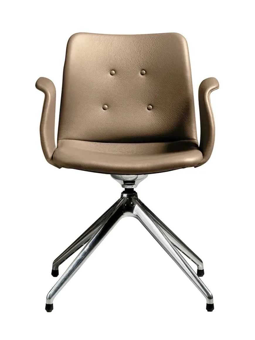 Den karakteristiske ryg bøjer sig let og tilpasser sig brugerens rygsøjle, hvilket giver optimal støtte gennem hele arbejdsdagen. Sæde og ryg er polstret med formstøbt koldskum og betrukket med eksklusive tekstiler eller læder. Det firestjernede drejeunderstel i poleret eller sortlakeret aluminium sikrer både stabilitet og bevægelsesfrihed.