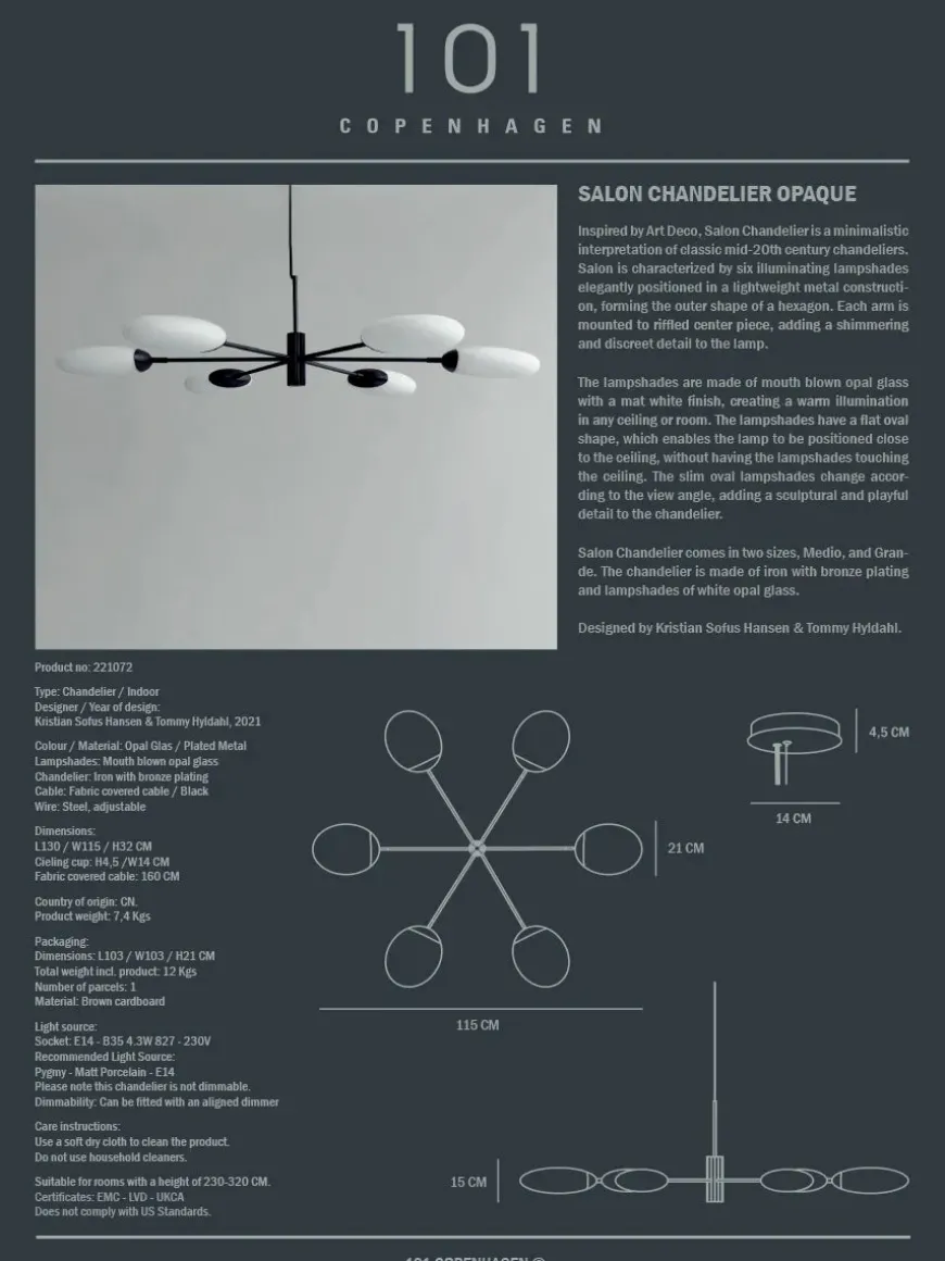 Salon lysekrone grande fra 101 Copenhagen er smuk og elegant. Lysekronen er en minimalistisk fortolkning af de klassiske lysekroner fra midten af det 20. århundrede med et moderne twist. Kendetegnet for Salon lysekronen er de 6 ovale lampeskærme med mat hvid finish, som er placeret i en letvægtsramme, der danner yderkonturen af en hexagon. En ekstra detalje ved denne lysekrone er den riftlet midterdel, der gør lampen sofistikeret. De ovale lampeskærme gør, at lysekronen kan hænge tæt på loftet.