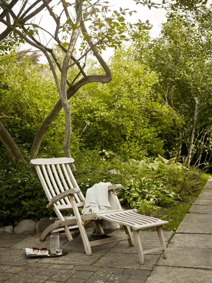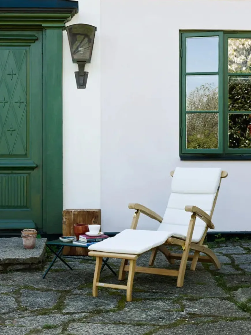 Skagerak Steamer dækstol. Liggestolen er justerbar og er udført i teaktræ. Det er muligt at vælge en hynde til solsengen fra Fritz Hansen nedenfor.