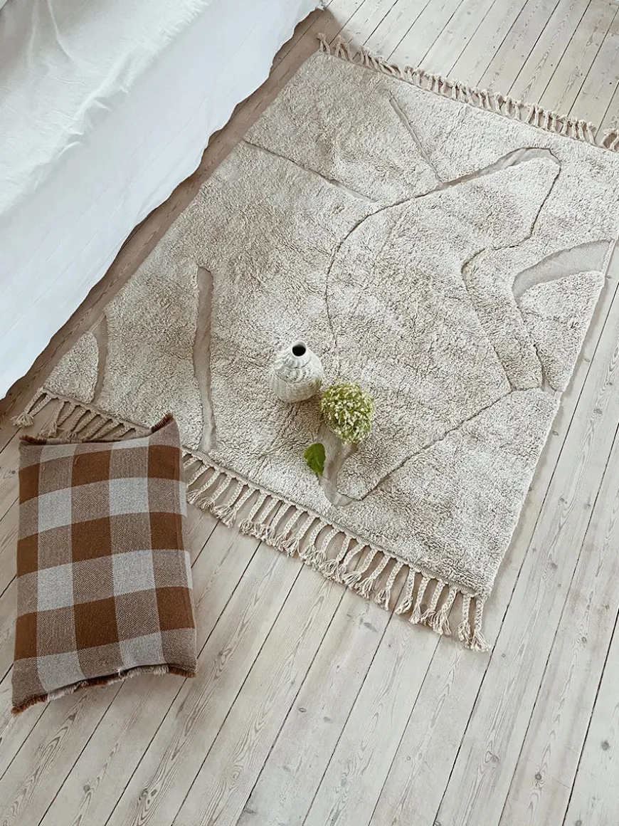 Smukt håndlavet gulvtæppe i blødt bomuld, som er perfekt til at skabe hygge og fuldende indretningen i både børneværelset, soveværelset eller stuen. Tæppet kan vaskes i maskinen på 30 grader hvilket er yderst praktisk, hvis man har allergi, børn eller bare skulle komme til at spilde på tæppet. Med anti-slip på undersiden, undgår du at glide rundt på det, dog anbefales at have et skridsikkert underlag. Små fnug kan forekomme i starten, hvilket er fibre fra selve processen tæppet vil gradvist fælder mindre og mindre og til sidst stopper.
