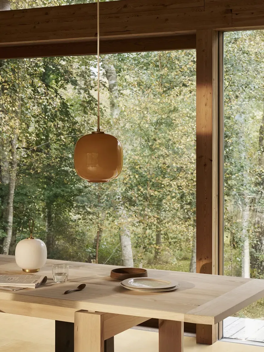Den store glasskærm spreder lyset på en lækker måde, og kan både bruges over spisebordet, over køkkenbordet eller som primært lys i et rum.