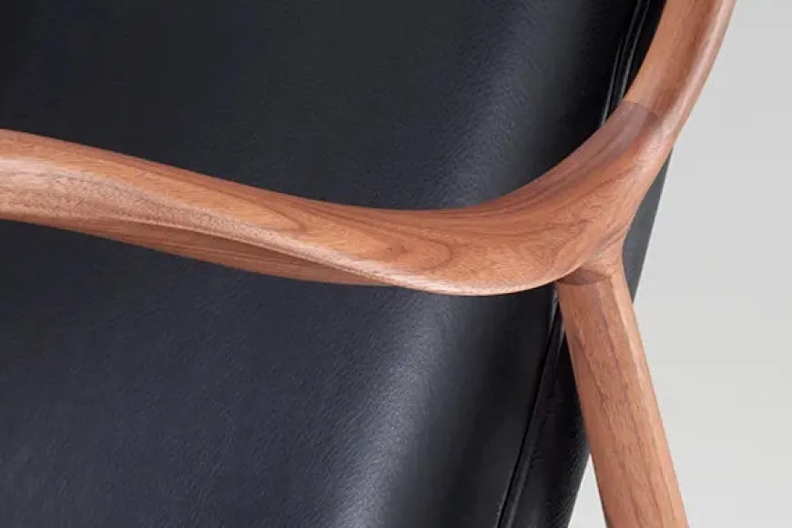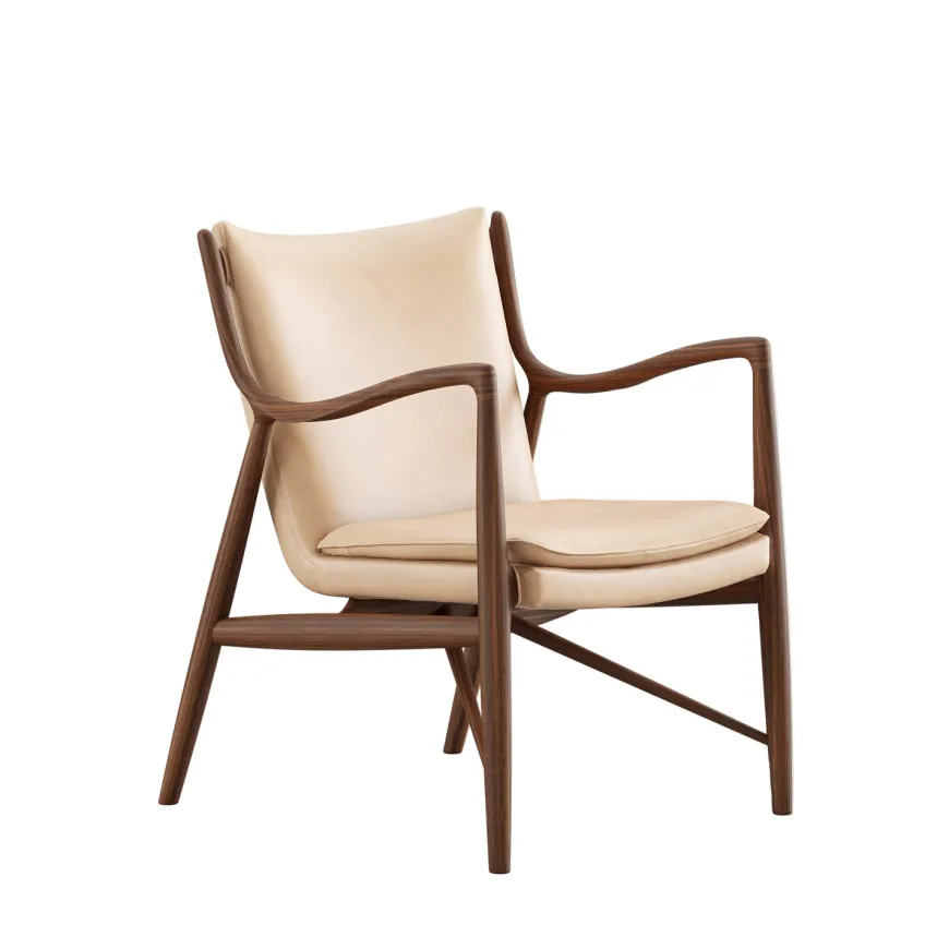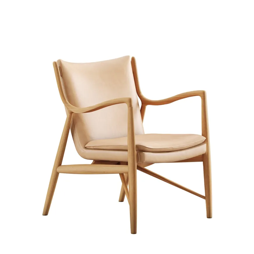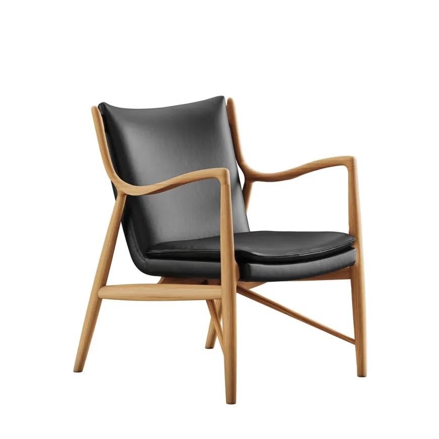 45 Lænestolen af Finn Juhl er et ikonisk værk i dansk designhistorie og anses som et højdepunkt inden for moderne møbelkunst. Stolen blev skabt i 1945 og var på sin tid banebrydende med sine bløde, organiske linjer og den karakteristiske konstruktion, hvor sæde og ryg synes at svæve uafhængigt af rammen. Den er håndlavet i massivt egetræ, behandlet med olie, og betrukket med eksklusivt Elegance-læder. De skulpturelle armlæn og den omhyggeligt udformede ergonomi giver stolen både visuel lethed og fremragende komfort. I dag produceres 45 Lænestolen stadig af House of Finn Juhl med samme dedikation til kvalitet og traditionelt håndværk.