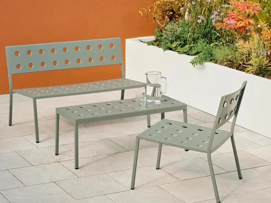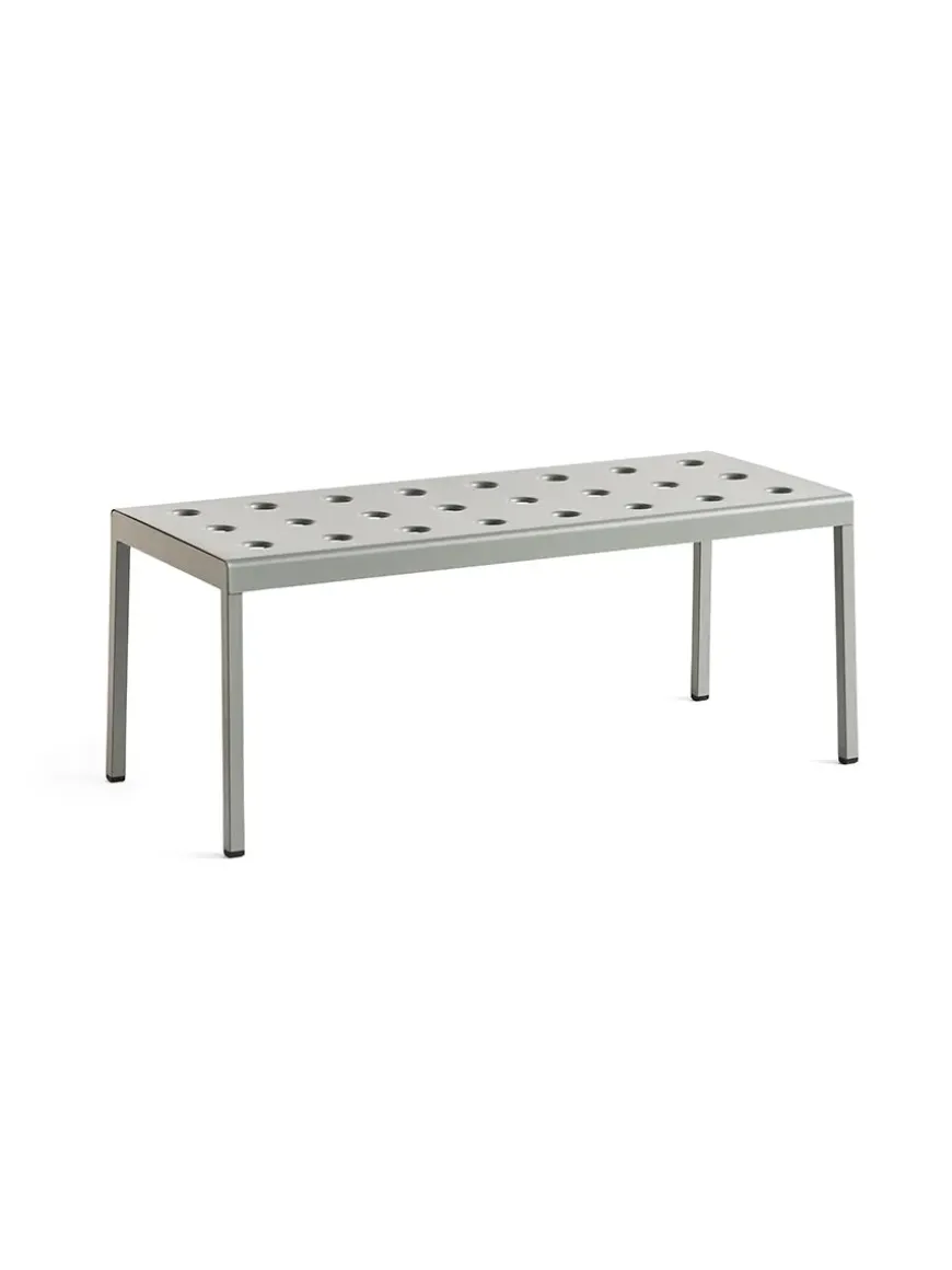 Balcony table er en udendørs lille havebord som med sin rektangulære form passer ind i på mange terrasser eller mindre altaner. bordpladen har flere huller, som giver en stabil konstruktion og gør det let for regnvandet at løbe væk. Bordet er lavet i pulverlakeret stål, med en udendørslakering, som er specielt egnet til det danske vejr. Det lave bord kan bruges sammen med Balcony bænkene, for at skabe en mere loungestemning på altanen eller terrassen. Terrassebordet findes i flere forskellige farver og flere størrelser. Mål: Længde: 96 cmHøjde: 39 cmBredde: 41 cm