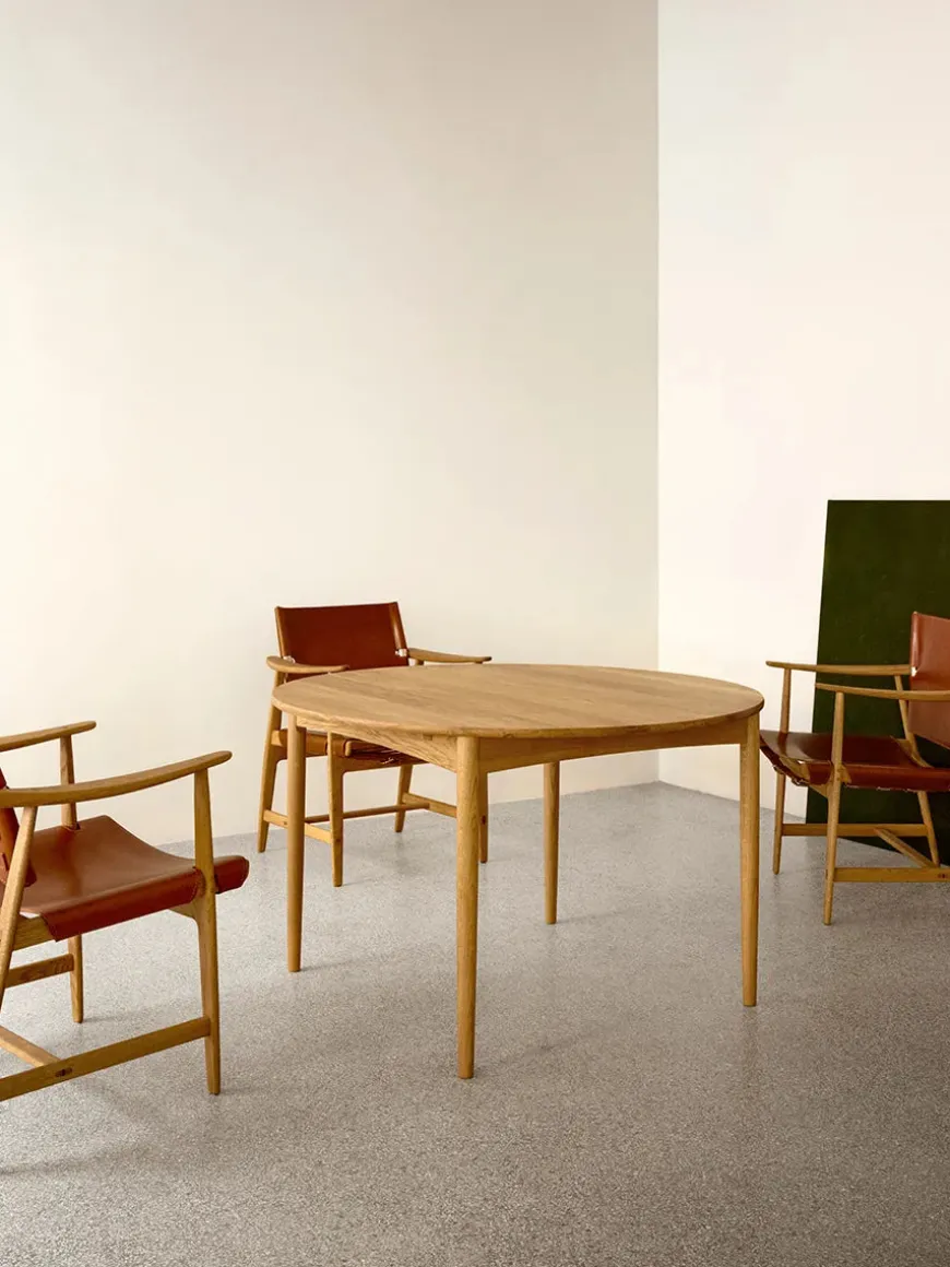BM0121 spisebordet fra Carl Hansen & Søn er et ikonisk møbel skabt af den danske designer Børge Mogensen, en af de mest indflydelsesrige skikkelser inden for dansk møbelkunst. Med sin funktionelle æstetik og kompromisløse kvalitet er BM0121 et klassisk eksempel på Mogensens designfilosofi: enkelhed, solidt håndværk og en tidløs udstråling. Det runde spisebord er udført i massivt træ, hvor materialernes naturlige skønhed og holdbarhed kommer til sin ret. De rene linjer, det robuste understel og den velproportionerede bordplade sikrer både stabilitet og elegance. Til BM0121 spisebordet kan der tilkøbes tillægsplade, således du kan gøre bordet større. Det runde spisebord kommer i enten sæbebehandlet eller oliebehandlet egetræ.