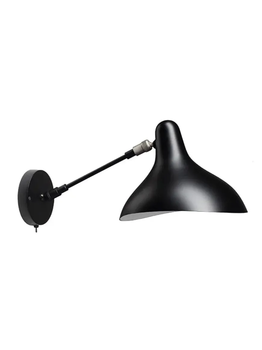 Mantis væglampe med kontakt på basen, uden ledning. Det sorte Mantis væglampe er designet af Bernard Schottlander i 1951 og laves også i en model uden tænd/sluk knap – se nedenfor.