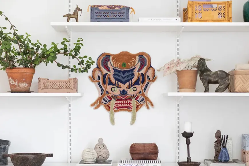 Burma Dragon Face Rug er håndlavede væg/gulvtæppe i 100% uld. Brug det dekorative tæppe overalt i hjemmet. Det kan både fungere som gulvtæppe i entréen eller på børneværelset. Tæppet har desuden ophæng, så du kan bruge det som en del af din gallerivæg.