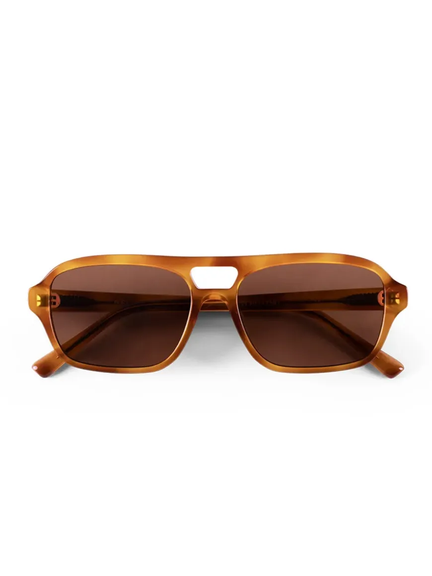 Seje solbriller fra MessyWeekend. BURT solbrillen er en aviator-brille. Her med stel i brown havana, der bløder solbrillen op.