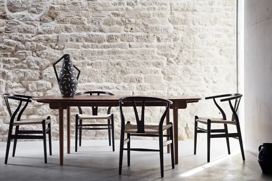 Carl Hansen spisebord CH338, designet af Hans J. Wegner i 1962. Bordet har mange kombinationsmuligheder, bliver lavet helt efter behov. Det funktionelle bord med den ellipseformede bordplade i eg, bøg, mahogni eller valnød.