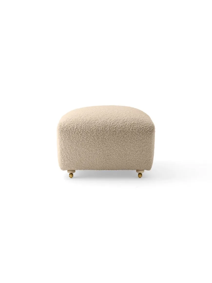 Den matchende fodskammel til Den Trætte Mand er nu polstret i Baena bouclé fra Limonta – Baena 14 (hvid). Den taktile bouclé fremhæver de bløde, afrundede linjer og gør skamlen til et naturligt supplement til lænestolen. Vælg ben i eg eller mørkbejdset eg, og nyd de forreste messinghjul som gør den let at flytte.