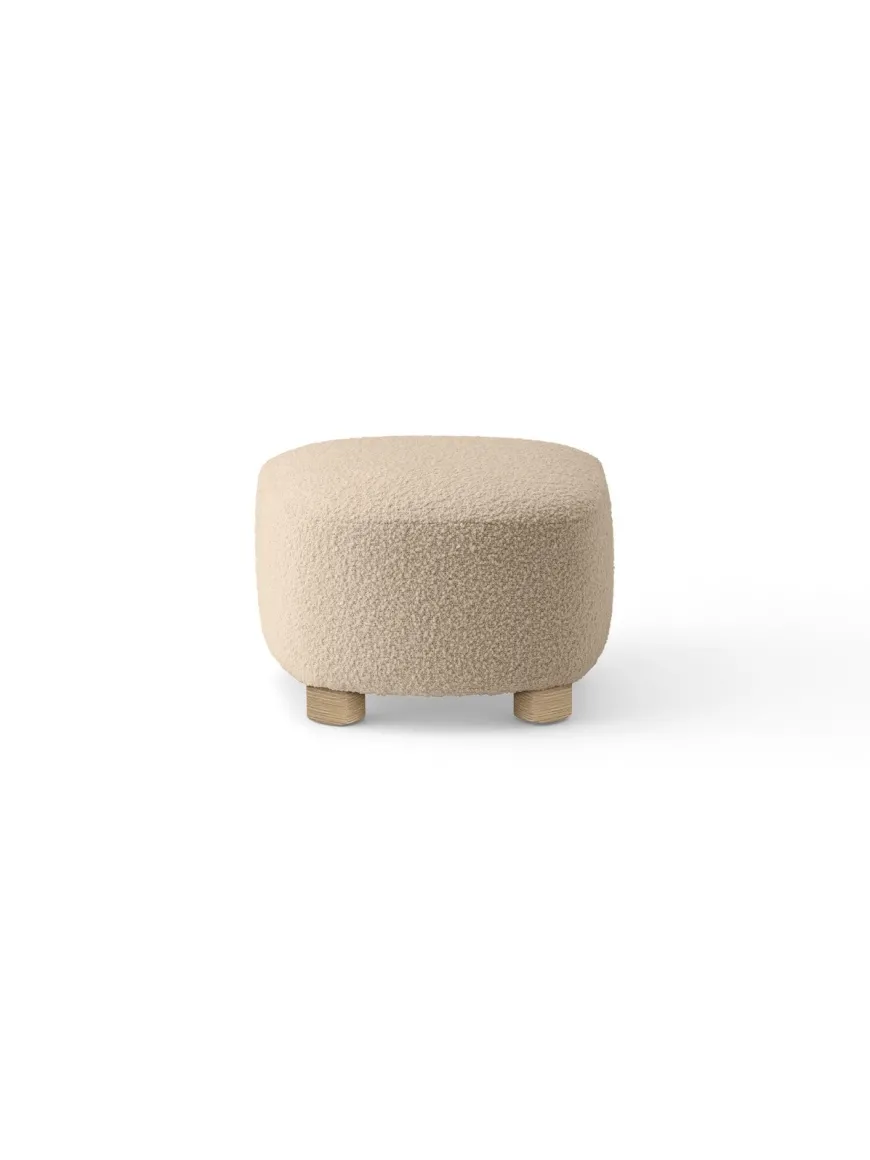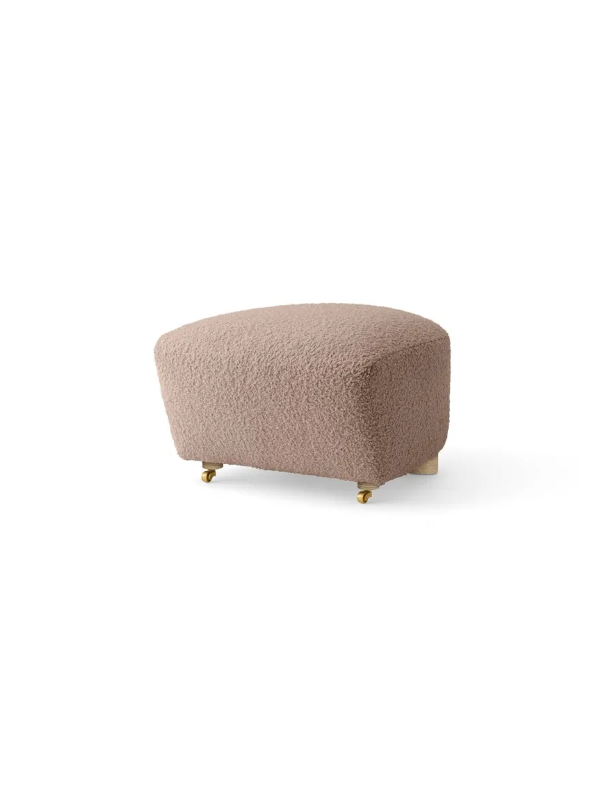 Den originale fodskammel til Den Trætte Mand – polstret i Baena 93, en dyb, neutral bouclé fra Limonta med markant taktilitet. Den afrundede form støtter benene naturligt og forlænger komforten i læsestolen. Vælg ben i eg for varm, naturlig ro – eller mørkbejdset eg for en mere grafisk kontrast. De forreste messinghjul giver et elegant udtryk og gør skamlen let at flytte.