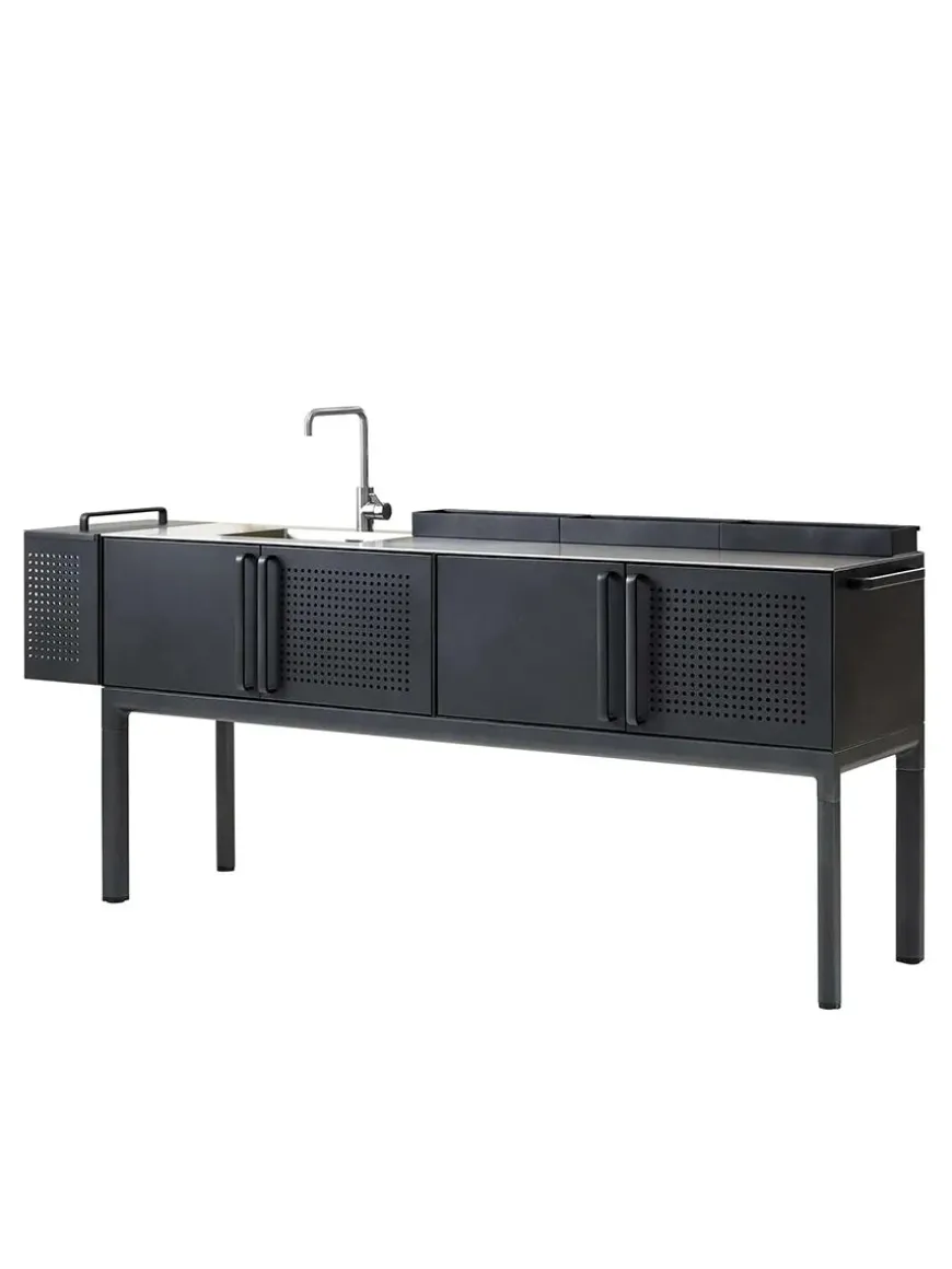Drop ude køkken fra Cane-line. Hovedmodulet i farven Lava Grey leveres inklusiv en skraldespand samt to hanke med en køkkenvask og armatur samt køkkenbordplade i rustfrit stål. Det er muligt at tilkøbe en samt en . Mål: Bredde: 200 cm Dybde: 50 cm Højde: 92,5 cm Model: 3550AL-P3550ST