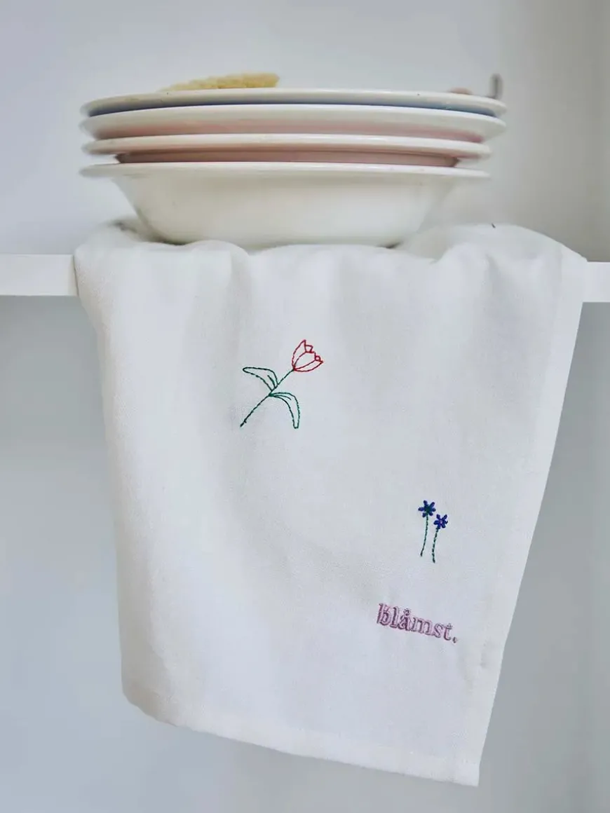 Bring en naturlig og romantisk stemning ind i køkkenet med Flower viskestykke fra Blåmst, broderet med fine håndtegnede blomster. Inspireret af danske markblomster tilfører dette viskestykke et strejf af sommer og natur til dine daglige køkkenrutiner.