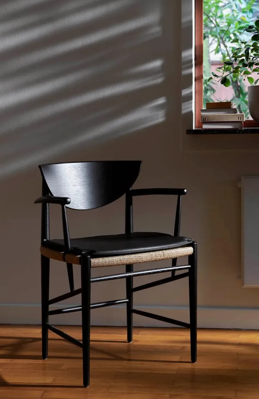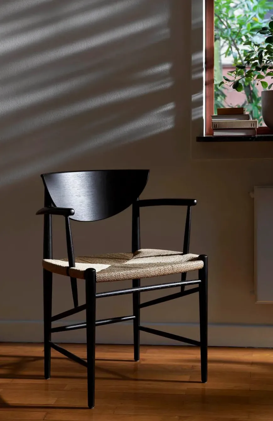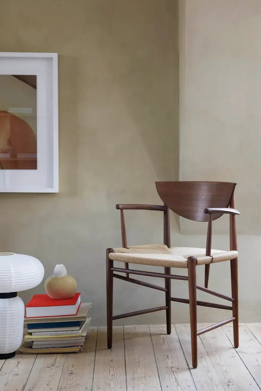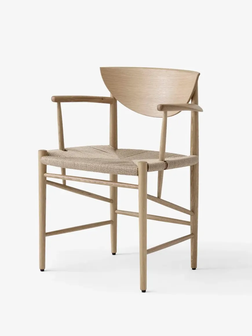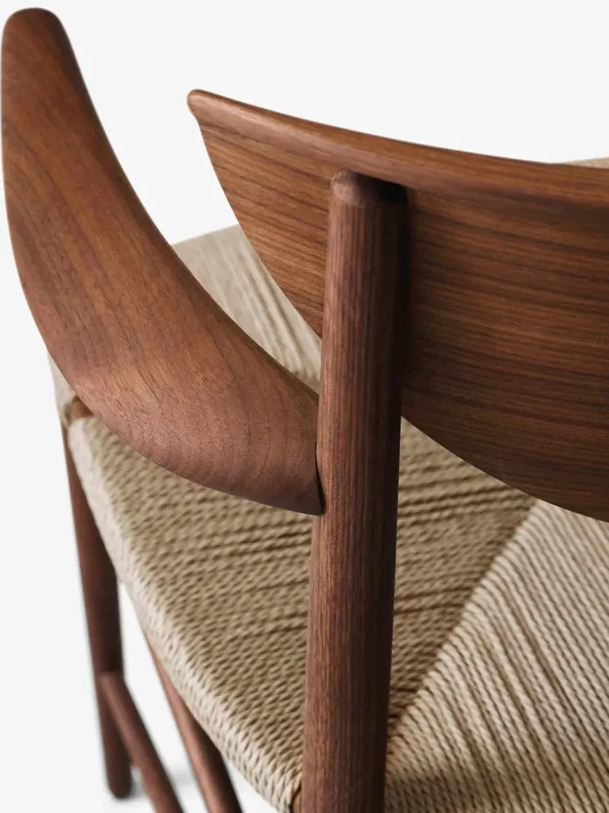 Med HM4 Drawn får du den originale varme og ærlighed fra dansk designarv ind i spisestuen. Hvidt og Mølgaard tegnede modellen i 1956 med et generøst sæde og organiske linjer som inviterer til at blive siddende længe. Stellet er drejet og fræset i massivt træ, ryglænet er formpresset og sædet håndflettet i naturpapirledning der giver en behagelig elastisk komfort. Proportionerne er omhyggeligt afstemt og de smukke armlæn giver naturlig støtte ved bordet. Vælg mellem olieret eg sortlakeret eg eller olieret valnød og tilføj eventuelt den tilpassede læderhynde for ekstra blødhed. En klassiker der patinerer smukt og fungerer lige godt i moderne som klassiske rum.