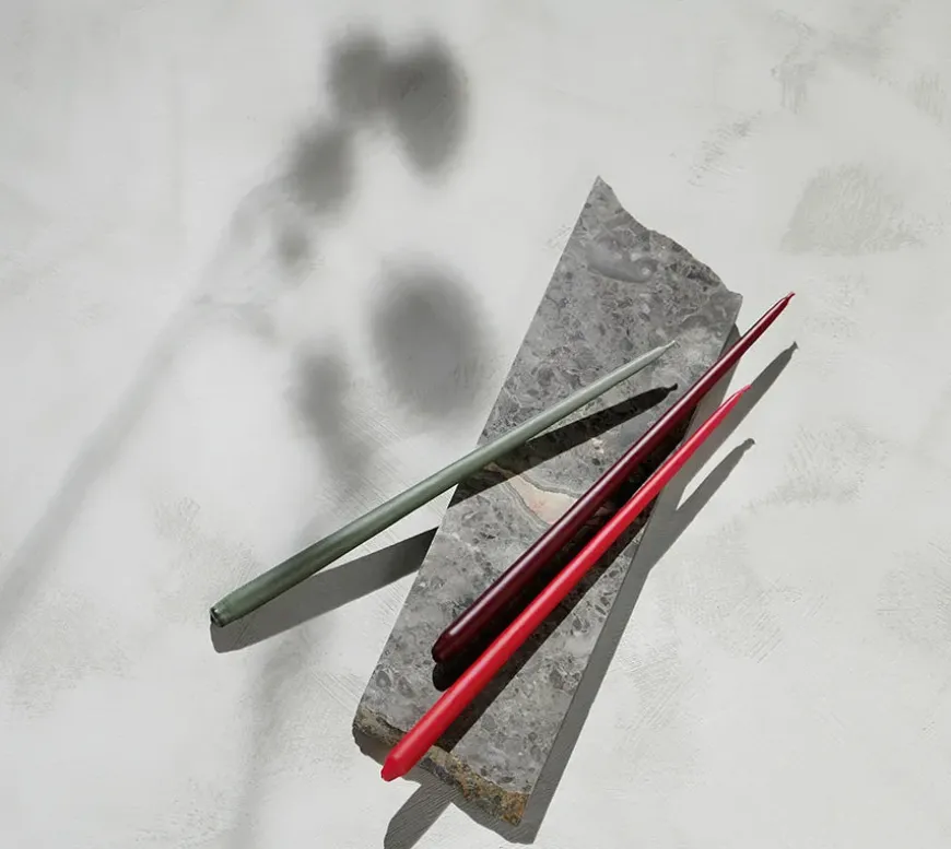 De eksklusive, håndfarvede STOFF Nagel kertelys er lavet af danske Ester & Erik og har en lang og konisk form med en kegleformet bund, så de passer perfekt i lysestagerne. Lysene drypper ikke, er selvslukkende og brænder langsomt og elegant ud, så der ikke er rester tilbage i dine lysestager.