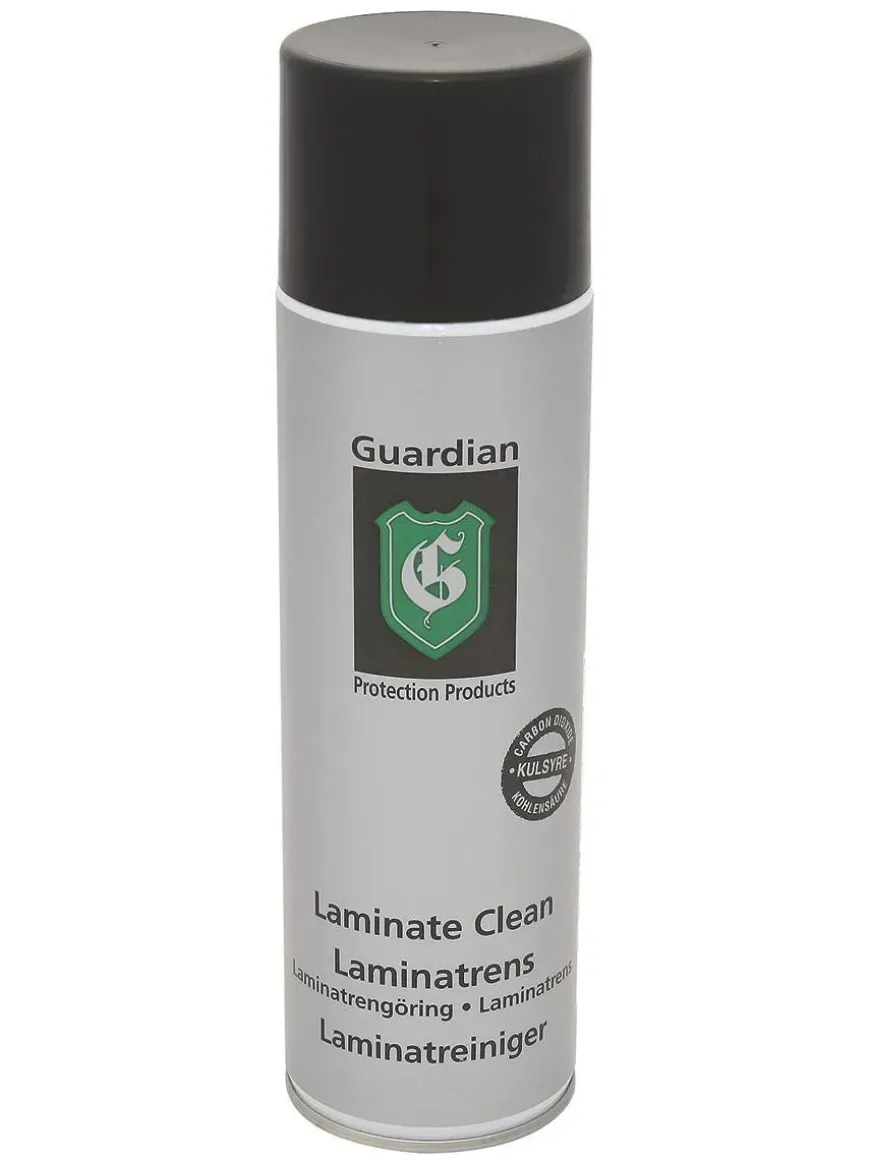 Guardian laminat rens 500ml. Guardian Laminatrens anvendes til rengøring og opfriskning af laminatoverflader (vinyl, plast og formica), hvor det renser overfladen samt tilfører beskyttende hinde. Guardian Laminatrens er af miljø- og sikkerhedshensyn fremstillet med kulsyre som drivmiddel.