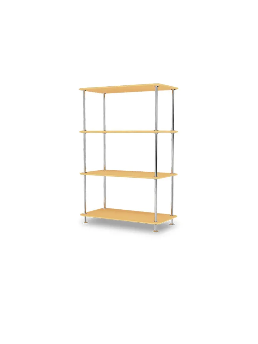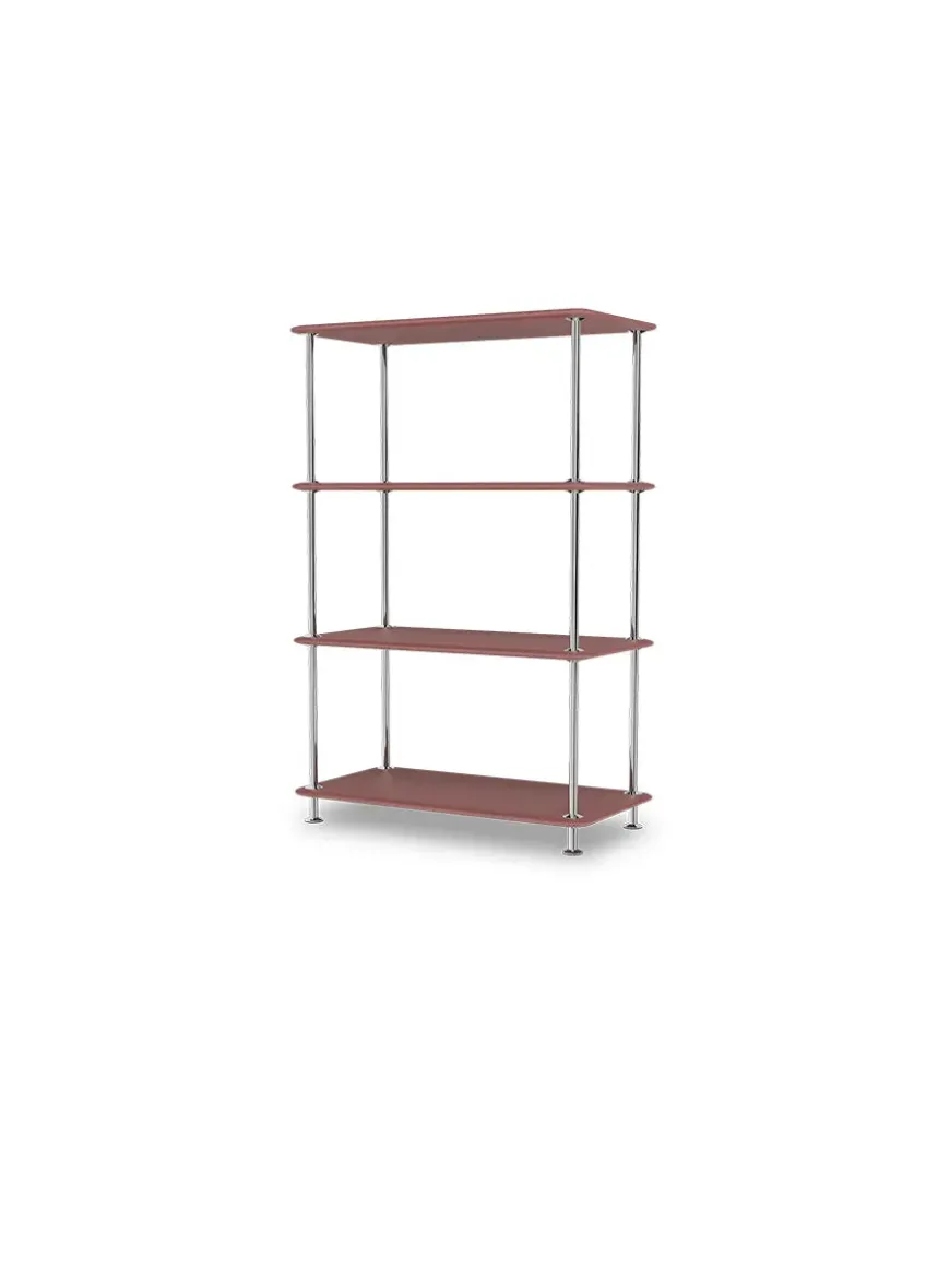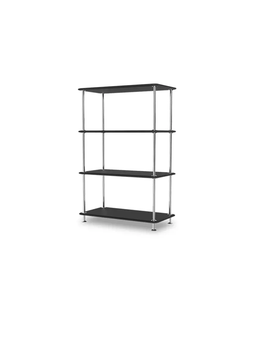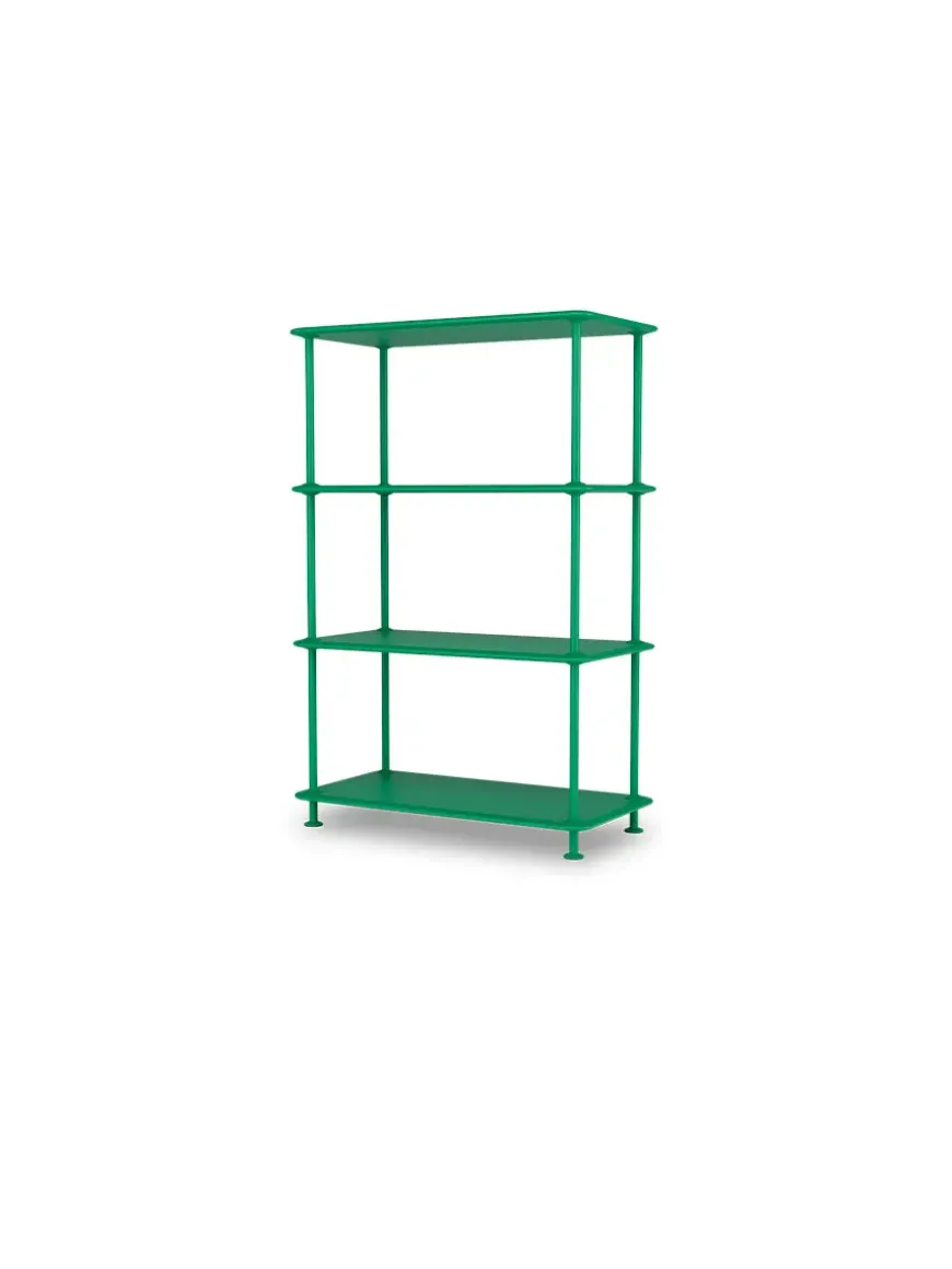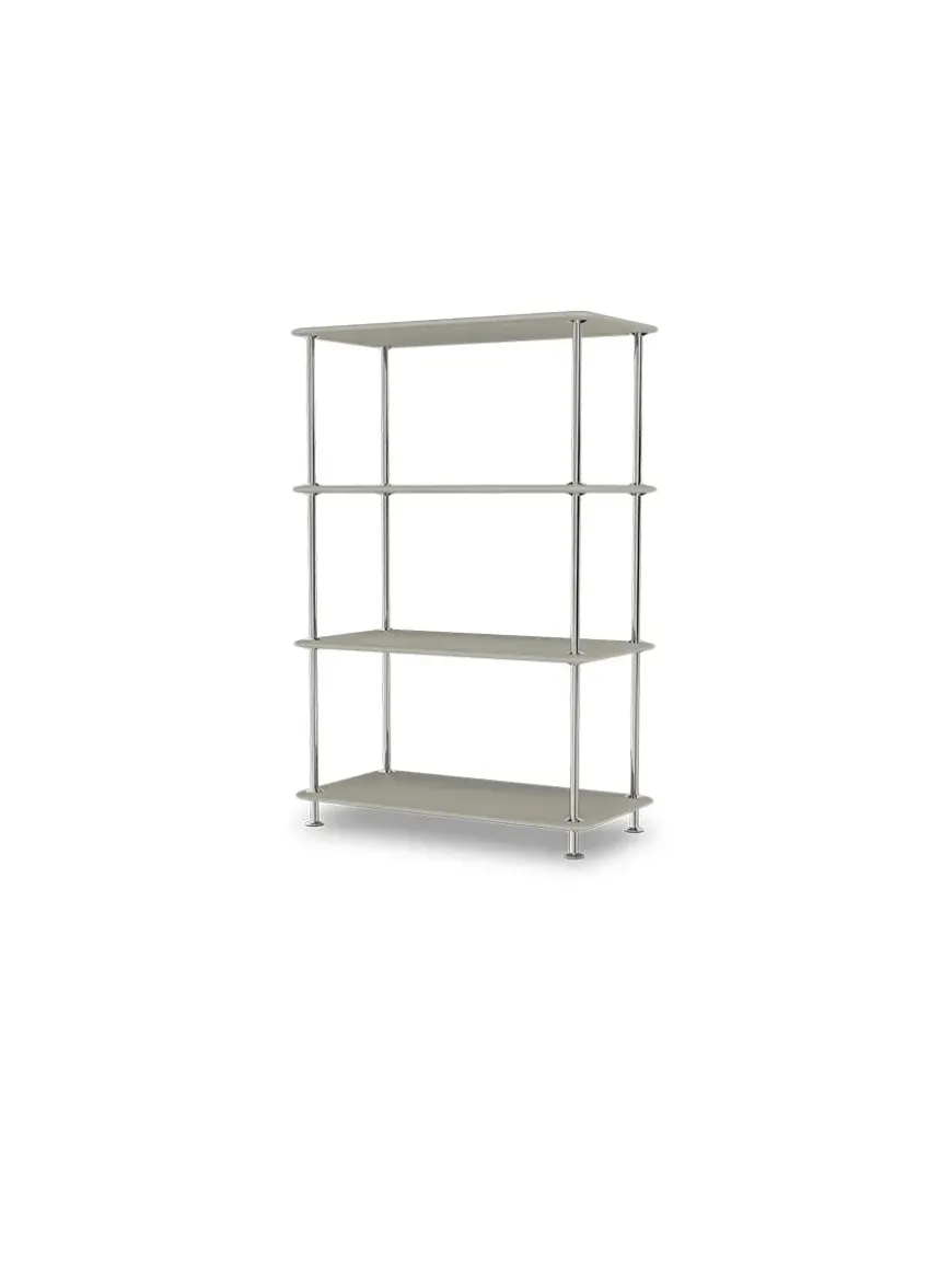 Montana Free reolsystemet er opbygget af lakerede MDF-hylder i dybde 38 adskilt af tynde stager i krom, der giver et let og svævende udtryk og understreger de horisontale hylder.