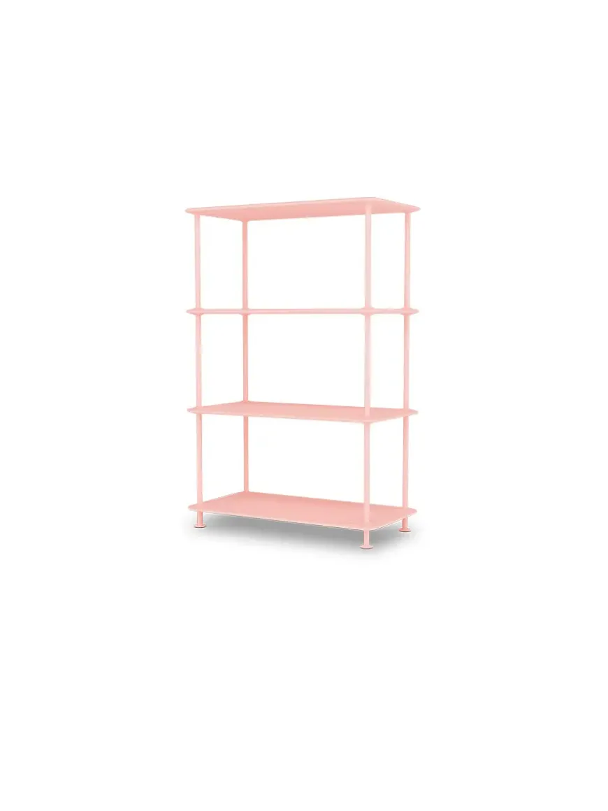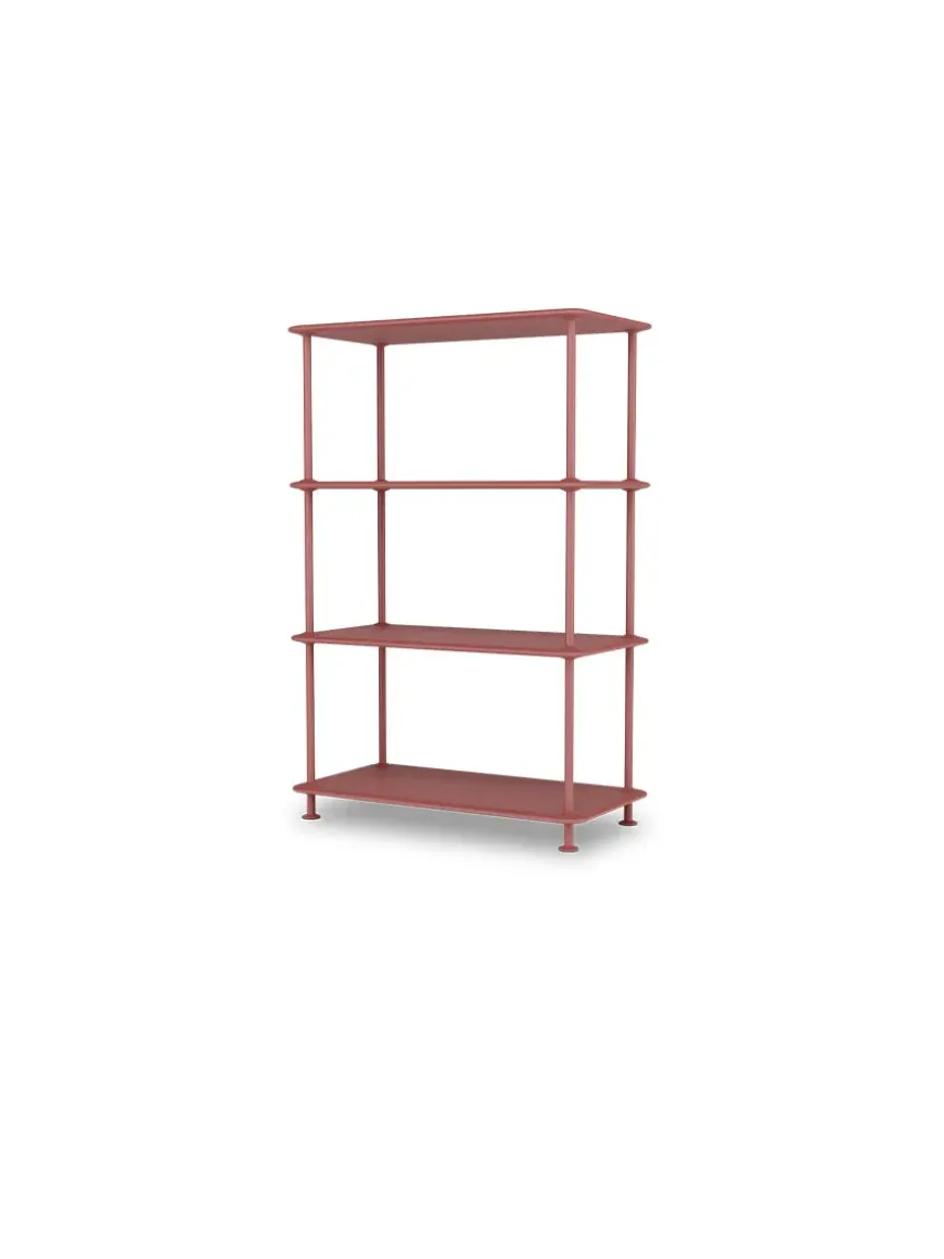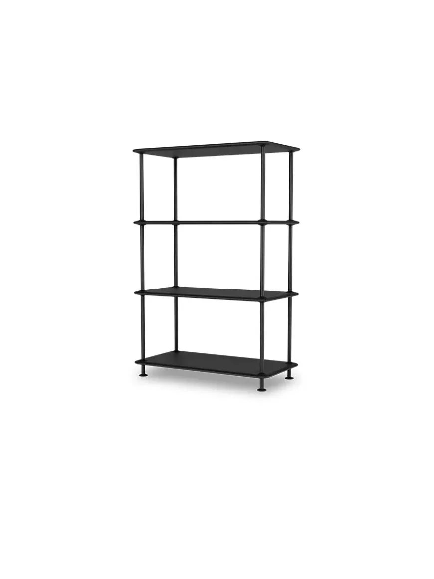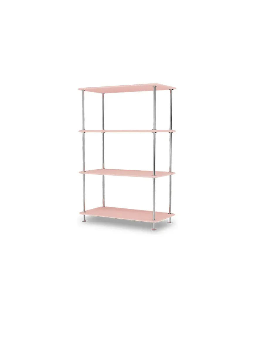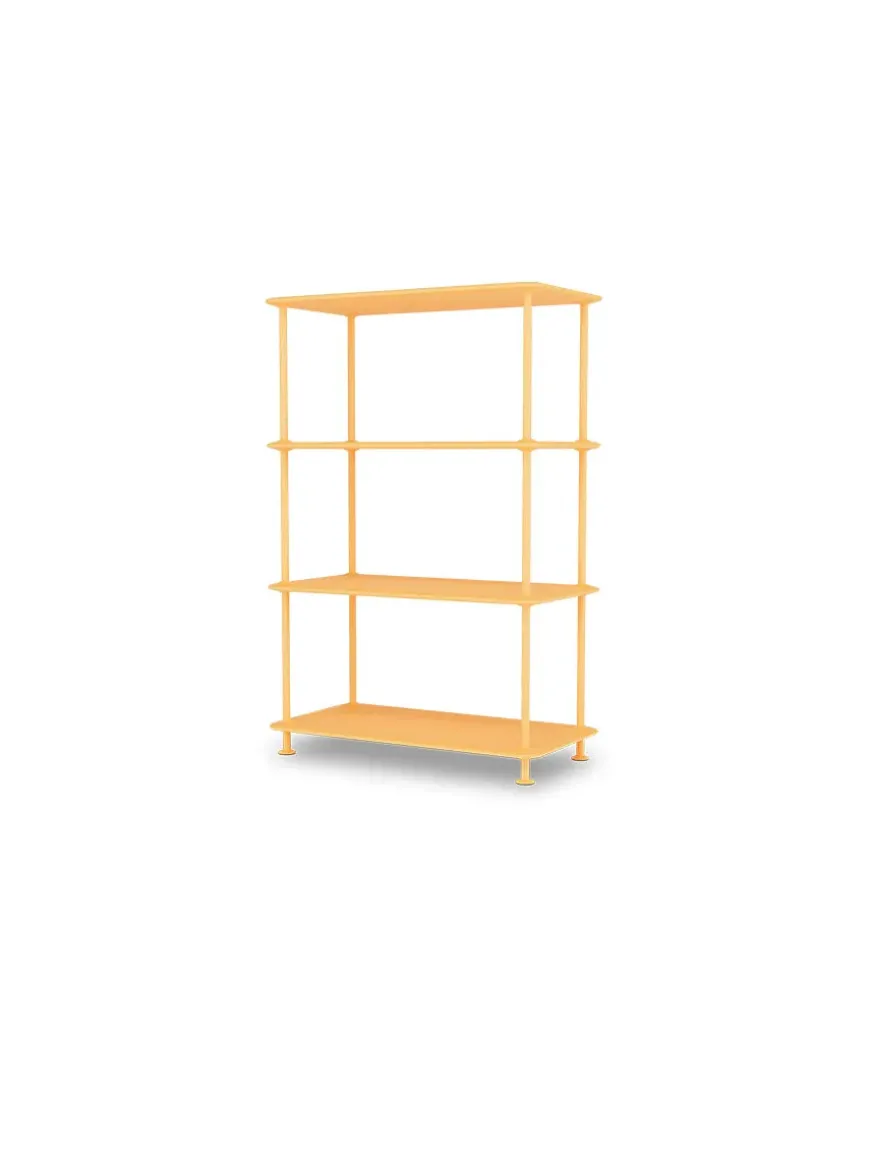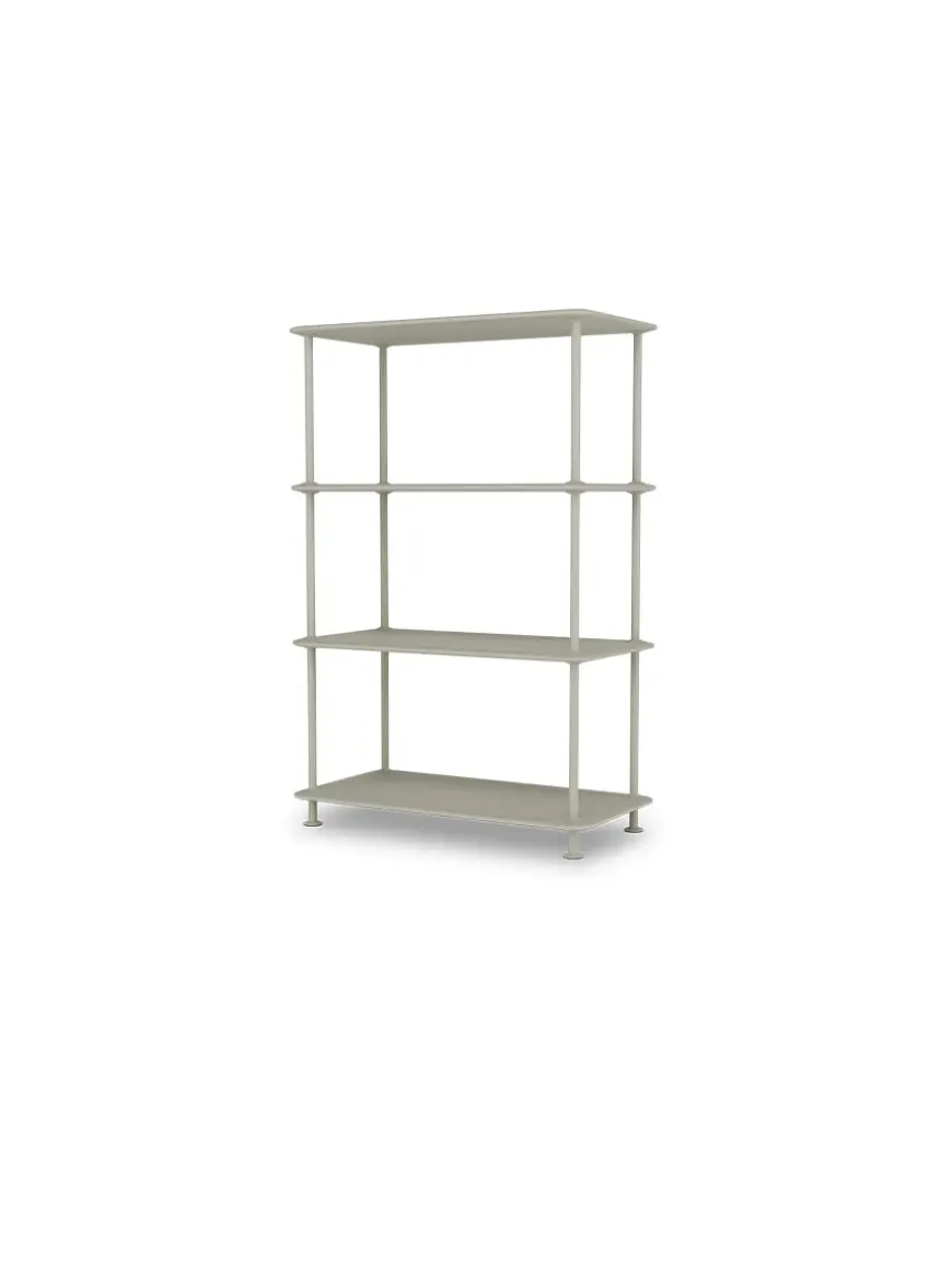 Montana Free reolsystemet er opbygget af lakerede MDF-hylder i dybde 38 adskilt af tynde stager i krom, der giver et let og svævende udtryk og understreger de horisontale hylder.