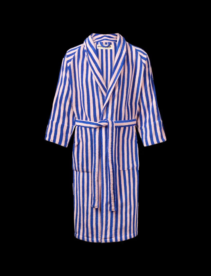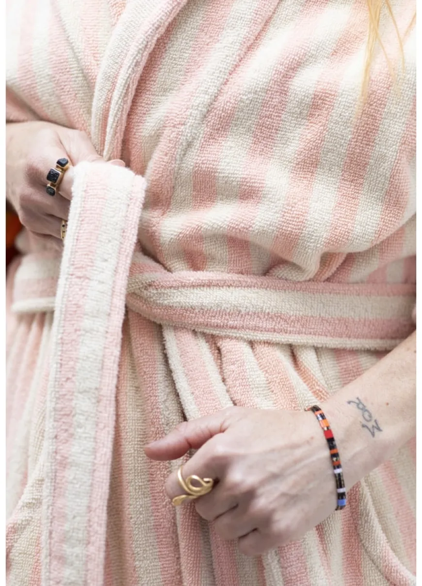 Indhyld dig i blød komfort med Naram badekåben fra Bongusta i Tropical & Creme – en stribet klassiker med sjalkrave, bindebælte og to rummelige lommer, skabt til langsomme morgener, efter badet eller en dukkert. Vævet i 100% kæmmet, OEKO-TEX®-certificeret bomuldsfrotté i en fyldig 385 g/m²-kvalitet, der både absorberer effektivt og føles silkeblød mod huden. Naram er håndlavet i Indien og har en generøs, indhyllende pasform, der giver god bevægelsesfrihed. Fås i S/M (ca. 122 cm) og L/XL (ca. 138 cm); vælg L/XL, hvis du er over 176 cm eller foretrækker et oversized look. For at bevare blødheden anbefales vask ved 40°C med lignende farver – gerne før første brug.