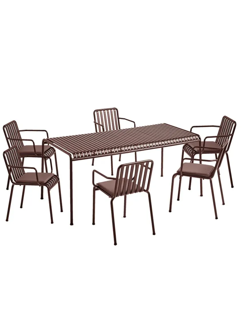 HAY Palissade Collection Den efterånden velkendte og holdbare Palissade kollektion fra HAY er både funktionel og smuk at se på. Her i et sæt med 6 armstole og et spisebord i farven “Sky Grey”. Sættet er inklusive 6 sædehynder.