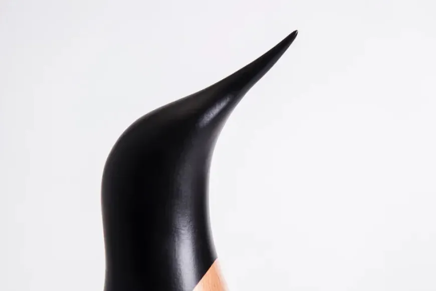 Mens den glansfulde håndmalede bagside minder om blanke pingvinfjer i den skarpe antarktiske sol, så er forsiden af fuglen bevaret i det rå, ubehandlede træ. Nøgent afsløres her de unikke linjer i naturmaterialet, der kun bliver smukkere med årene.