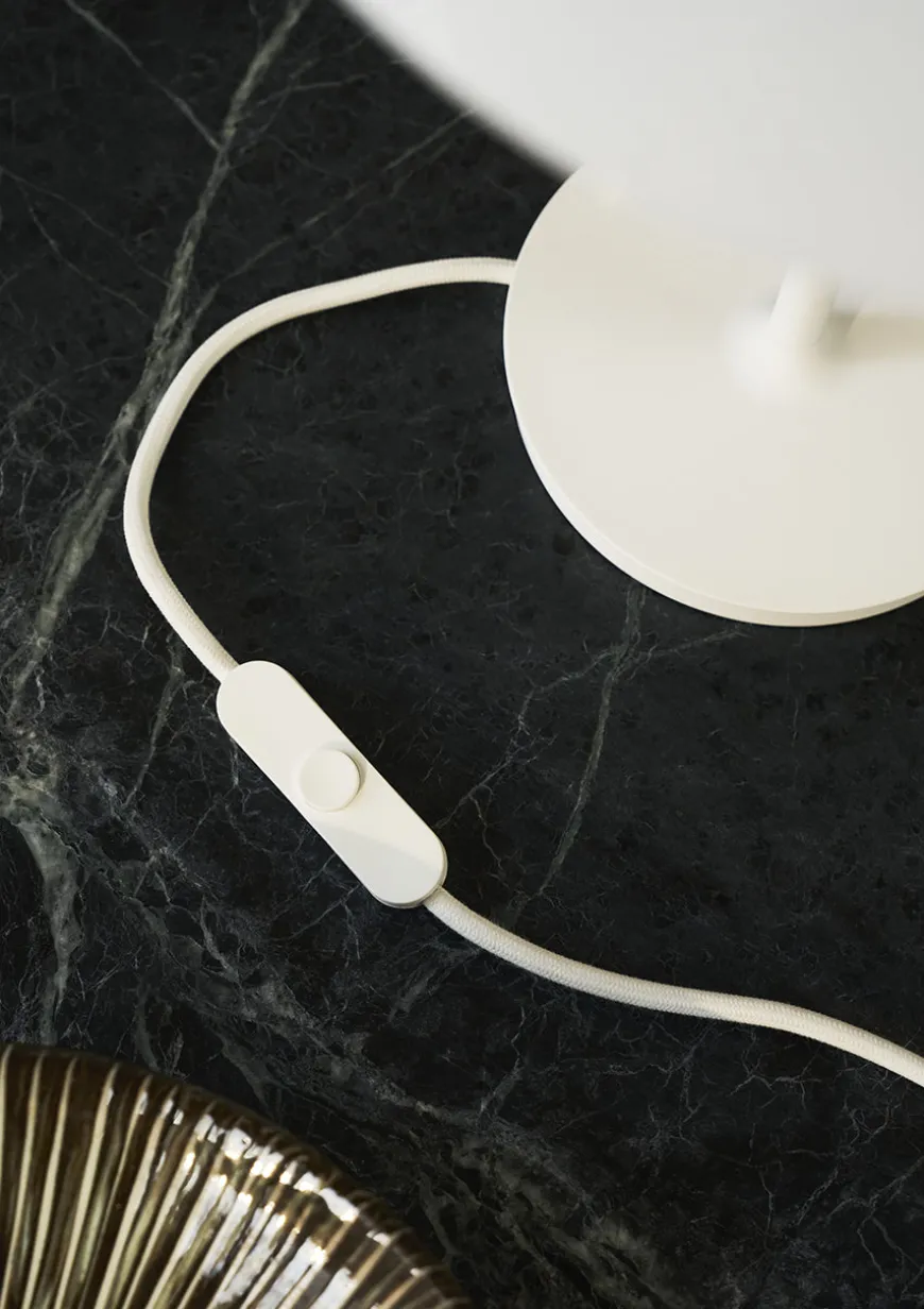 Bordlampen er her med opal hvide skærme med hvidt stel.