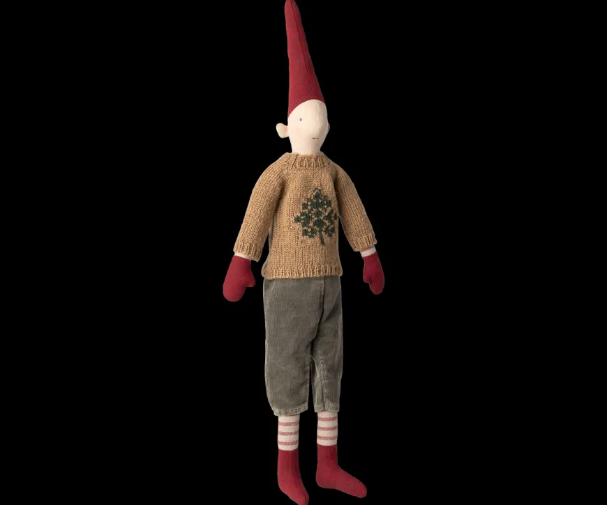 Mailegs Pixy-nisser er små klassikere, der skaber tradition og hygge i hjemmet. Denne Pixy i størrelse 3 er en dreng iført bukser og strik, hvor han holder en lille kvist – en charmerende detalje, der understreger hans rolige, nostalgiske udtryk. Med sin højde på ca. 49 cm passer han perfekt til vindueskarmen, på en hylde eller som en del af en juleopstilling med andre Pixy-nisser. Figuren er syet i bomuld med blødt fyld, og de håndlavede detaljer gør hver nisse helt unik. En julefigur, der kan tages frem år efter år og blive en fast del af december traditionen.