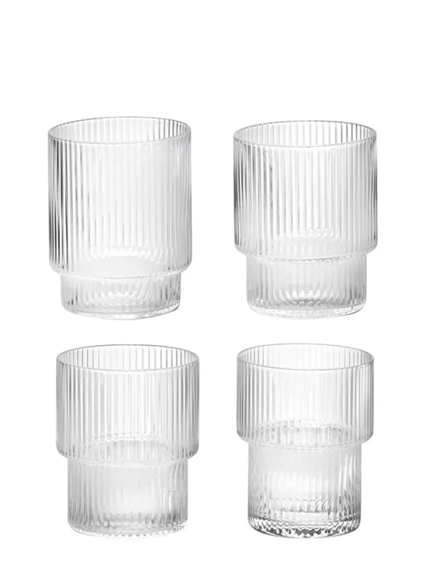 Ripple glas fra Ferm Living. Leveres i sæt med 4 forskellige glas med riller. I serien findes der også en karaffel.