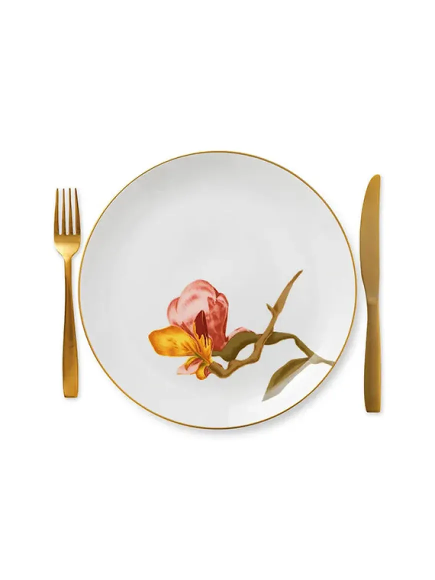 Denne tallerken er en del af serien Flora fra Royal Copenhagen. Den er udsmykket med en smuk magnolia og den karakteristiske guldkant som pynter hele vejen rundt om tallerkenens kant.