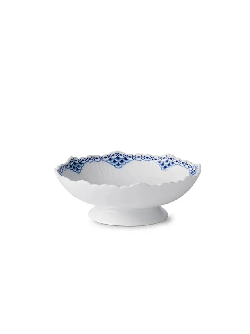 Skålen på fod fra serien Prinsesse måler 17 cm og er udsmykket med den smukke blondekant, som er håndmalet af dygtige malere lige siden 1978. Opsatsen kan bruges til anretning af småkager, frugt eller som en smuk udsmykning i hjemmet.
