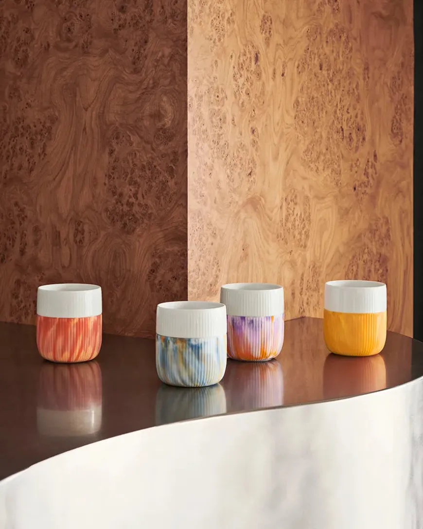 Royal Copenhagen udvider deres Riflet Contrast-kollektion med Riflet Contrast Marble, der er et nyt perspektiv på kollektionen. Inspirationen kommer fra de næsten overnaturlige farver i kollektionen. Hvert krus er unikt, da de marmorerede mønstre og nuancer aldrig vil være helt ens. Kruset i Warm Ochre fanger jordens varme toner. Riflet Contrast Marble serien er designet af H. C. Gjedde. Koppen indeholder 35 cl. De hvide porcelænskrus er sammensat med et farverigt omslag af silikone, som er praktisk, når man skal holde om det varme krus. Det anbefales at tage silikoneomslaget af, når produktet kommer i opvaskemaskinen. Herved undgår man at det bliver løst og fedtet.