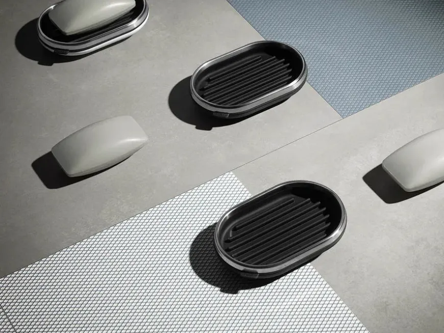 Med dele der kan gå i opvaskemaskinen, kan sæbeskålen let skilles ad og rengøres. En silikonebase beskytter overflader, mens en rillet indsats holder sæben tør.