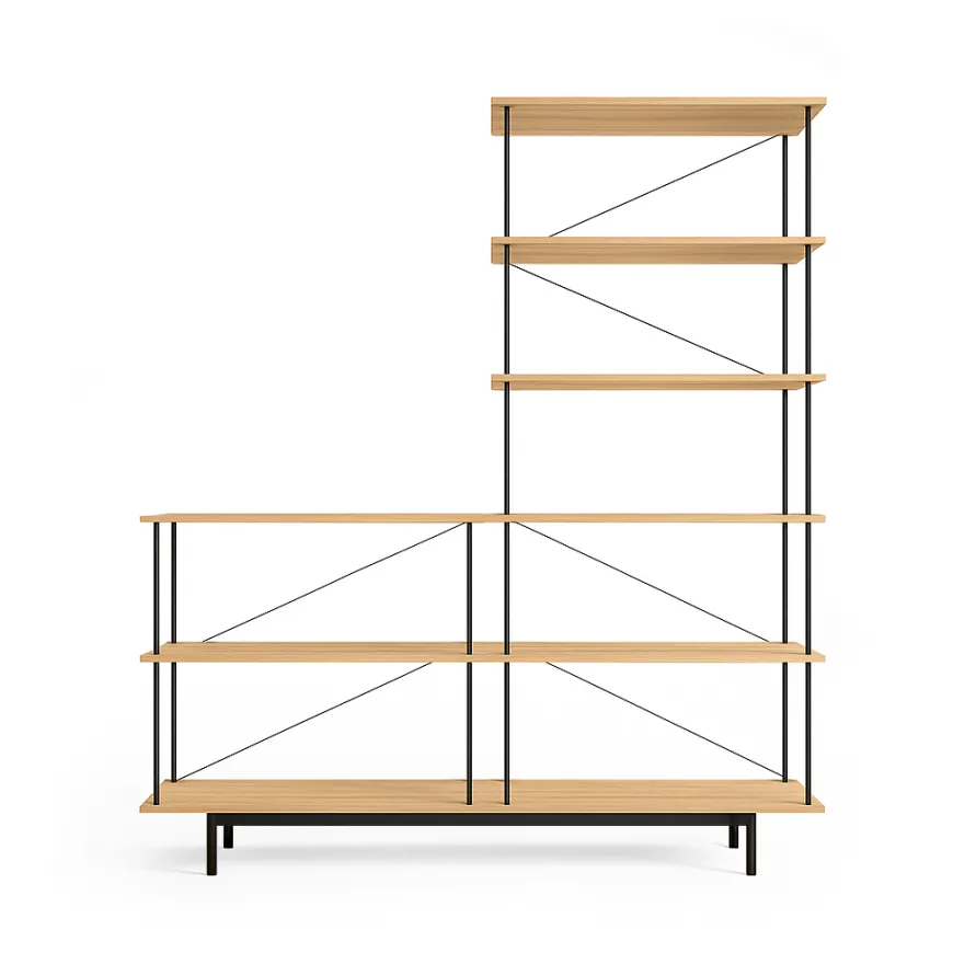 Denne version, 3-3 Right, har et karakteristisk asymmetrisk forløb, hvor de højere sektioner til højre skaber en let og skulpturel balance. De lakerede egetræshylder tilfører varme og naturlig struktur, mens stel og sokkel i sort pulverlakeret stål giver en markant kontrast og grafisk ro.
